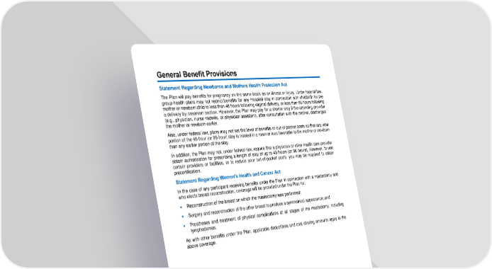 96 General Benefit Provisions Statement Regarding Newborn s and Mothers Health Protection Act The Plan will pay benefits for pregnancy on the same basis as an illness or injury. Under federal law, group health plans may not restrict benefits for any Hospital stay in connection with childbirth for the mother or newborn child to less than 48 hours following vaginal delivery, or less than 96 hours following a delivery by cesarean section. However, the Plan may pay for a shorter stay if the attending provider (e.g., physician, nurse midwife, or physician assistant), after consultation with the mother, discharges the mother or newborn earlier. Also, under federal law, plans may not set the level of benefits or out - of - pocket costs so that any later portion of the 48 - hour (or 96 - hour) stay is treated in a manner less fa vorable to the mother or newborn than a ny earlier portion of the stay. In addition, the Plan may not, under federal law, require that a physician or other health care provider obtain authorization for prescribing a length of stay of up to 48 hours (or 96 h ours). However, to use certain providers or facilities, or to reduce your out - of - pocket costs, you may be require d to obtain precertification. Statement Regarding Women’s Health and Cancer Act In the case of any participant receiving benefits under the Pl an in connection with a mastectomy and who elects breast reconstruction, coverage will be provided under the Plan for: • Reconstruction of the breast on which the mastectomy was performed; • Surgery and reconstruction of the other breast to produce a symmetric al appear ance; and • Prostheses and treatment of physical complications at all stages of the mastectomy, including lymphedemas. As with other benefits under the Plan, applicable deductibles and cost sharing amoun ts apply to the above coverage.