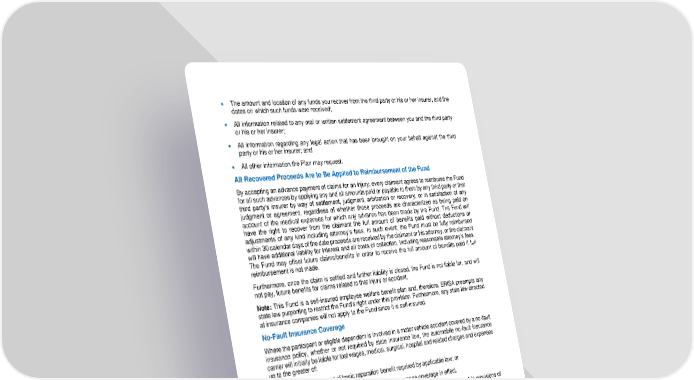 70 • The amount and location of any funds you recover from the third party or his or her insurer, and the dates on which such funds were received; • All information related to any oral or written settlement agreement between you and the third party or his or her insurer; • All information regarding any legal action that has been brought on your behalf against the third party or his or her insurer; and • All other information the Plan may request. All Recovered Proceeds Are to Be Applied to Reimbursement of the Fund By accepting an advance payment of claims for an injury, every claimant agrees to reimburse the Fund for all such advances by applying any and all amounts paid or payab le to them by any third party or that third party’s insurer by way of settlement, judgment, arbitration or recovery, or in satisfaction of any judgment or agreement, regardless of whether those proceeds are characterized as being paid on account of the med ical expenses for which any advance has been made by the Fund. The Fund will have the right to recover from the claimant the full amount of benefits paid without deductions or adjustments of any kind including attorney’s fees. In such event, the Fund must be fully reimbursed within 30 calendar days of the date proceeds are received by the claimant or his attorney, or the claimant will have additional liability for interest and all costs of collection, including reasonable attorney’s fees. The Fund may offse t future claims/benefits in order to receive the full amount of benefits paid if full reimbursement is not made. Furthermore, once the claim is settled and further liability is closed, the Fund is not liable for, and will not pay, future benefits for claim s related to that injury or accident. Note: This Fund is a self - insured employee welfare benefit plan and, therefore, ERISA preempts any state law purporting to restrict the Fund’s right under this provision. Furthermore, any state law directed at insuranc e companies will not apply to the Fund since it is self - insured. No - Fault Insurance Coverage Where the participant or eligible dependent is involved in a motor vehicle accident covered by a no - fault insurance policy, whether or not required by state insurance law, the automobile no - fault insurance carrier will initially be liable for lost wages, medical, surgical, hospital and related charges and expenses up to the greater of: • The maximum amount of basic reparation benefit required by applicable law; or • The maximum amount of the applicable no - fault insurance coverage in effect. The Plan will thereafter consider any excess charges and expenses under the applicable provisions of the respective Plan in which you are provided health coverage. Before relate d claims will be paid through the Fund, the participant or his/her eligible dependent will be required to sign a Reimbursement Agreement and Consent to Lien. If the participant or his/her eligible dependent fails to secure no - fault insurance as required by state law, the participant or eligible dependent is considered as being self - insured and must pay the amount of the basic medical reparation expenses for himself and/or his eligible dependents arising out of the accident.