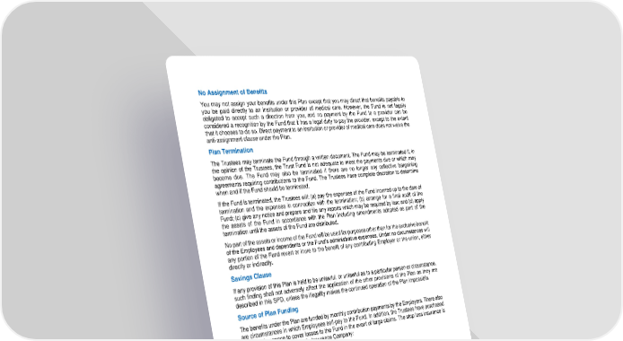 100 No Assignment of Benefits You may not assign your benefits under this Plan except that you may direct that benefits payable to you be paid directly to an institution or provider of medical care. However, the Fund is not legally obligated to accept such a direction from you, and no payment by the Fund to a provider can be considered a recognition by the Fund that it has a legal duty to pay the provider, except to the extent that it chooses to do so. Direct payment to an institution or provider of medical care does not waive the anti - as signment clause under the Plan. Plan Termination The Trustees may terminate the Fund through a written document. The Fund may be terminated if, in the opinion of the Trustees, the Trust Fund is not adequate to mee t the payments due or which may become due. The Fund may also be terminated if there are no longer any collective bargaining agreements requiring contributions to the Fund. The Trustees have complete discretion to determine when and if the Fund should be t erminated. If the Fund is terminated, the Trustees will: (a) pay the expenses of the Fund incurred up to the date of termination and the expenses in connection with the termination; (b) arrange for a final audit of the Fund; (c) give any notice and prepare and file any reports which may be required by law; and (d) apply the assets of the Fund in accordance with the Plan including amendments adopted as part of the termination until the asse ts of the Fund are distributed. No part of the assets or income of th e Fund will be used for purposes other than for the exclusive benefit of the Employees and dependents or the Fund’s administrative expenses. Under no circumstances will any portion of the Fund revert or inure to the benefit of any contributing Employer or the union, either directly or indirectly. Savings Clause If any provision of this Plan is held to be unlawful, or unlawful as to a particular person or circumstance, such finding shall not adversely affect the application of the other provisions of the Pla n as they are described in this SPD , unless the illegality makes the continued op eration of the Plan impossible. Source of Plan Funding The benefits under the Plan are funded by monthly contribution payments by the Employers. There also are circumstances i n which Employees self - pay to the Fund. In addition, the Trustees have purchased stop loss insurance to cover losses to the Fund in the event of large claims. The stop loss insurance is provided by Amalgamated Life Insurance Company: Amalgamated Life Ins urance Company 333 Westchester Avenue White Plains, NY 10604 914 - 367 - 5000 The continuation of this insurance arrangement is at the discretion of the Trustees. Benefits are provided only to the extent permitted by the contributions. If contributions are not sufficient to maintain benefits, the Board of Trustees (Board) reserves the right to change the eligibility rules, reduce or change the benefits, or eliminate the Plan, in whole or in part. The amount of contributions and the Employees on whose behalf contributions are made are determined by the provisions of the collective bargaining agreements or other agreements, as approved by the Trustees. The Employer must make the required payments for a month for coverage to be provided for the period. Th e Trustees reserve the right to terminate the participation of any Emplo yer at any time for any reason.