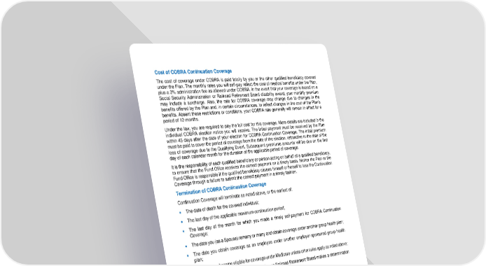 22 Cost of COBRA Continuation Coverage The cost of coverage under COBRA is paid totally by you or the other qualified beneficiary covered under the Plan. The monthly rates you will self - pay reflect the cost o f medical benefits under the Plan, plus a 2% administration fee as allowed under COBRA. In the event that your coverage is based on a Social Security Administration or Railroad Retirement Board disability award, your monthly premium may include a surcharge . Also, the rate for COBRA coverage may change due to changes in the benefits offered by the Plan and, in certain circumstances, to reflect changes in the cost of the Plan’s benefits. Absent these restrictions or conditions, your COBRA rate generally will remain in effect for a period of 12 - months. Under the law, you are required to pay the full cost for this coverage. More details are included in the individual COBRA election notice you will receive. The initial payment must be received by the Plan within 45 days after the date of your election for COBRA Continuation Coverage. The initial premium must be paid to cover the period of coverage from the date of the election, retroactive to the date of the loss of coverage due to the Qualifying Event. Sub sequent premiums amounts will be due on the first day of each calendar month for the duration of the applicable period of coverage. It is the responsibility of each qualified beneficiary or person acting on behalf of a qualified beneficiary, to ensure that the Fund Office receives the correct payment on a timely basis. Nether the Plan or the Fund Office is responsible if the qualified beneficiary causes himself or herself to lose the Continuation Coverage through a failure to submit the corre ct payment in a timely fashion. Termination of COBRA Continuation Coverage Continuation Coverage will terminate as noted above, or the earliest of: • The date of death for the covered individual; • The last day of the applicable maximum continuation period; • The last day of the month for which you made a timely self - payment for COBRA Continuation Coverage; • The date you (as a Spouse) remarry or marry and obtain coverage under another group health plan; • The date you obtain coverage as an employee under another employer - sponso red group health plan; • The date you become eligible for coverage under Medicare unless other rules apply as noted above; • The date the Social Security Administration or Railroad Retirement Board makes a determination that you are no longer disabled; • The da te the Plan terminates; or • The date your employer ceases to be a Contributing Employer, except as noted below. If your Employer stops participating in the National IAM Benefit Trust Fund, the Fund will continue to carry the COBRA Continuation Coverage bene fits for you, your Spouse, and your Eligible Dependent Children only if the Employer does not substitute another plan. If the Employer establishes one or more group health plans, or starts contributing to another multi - employer group health plan, the plan established by the Employer or the other multi - employer plan must make COBRA Continuation Coverage available to you, your Spouse and/or your Eligible Dependent Child, who: • Was receiving coverage under the Plan (including Retiree coverage) immediately befor e the Employer’s cessation of participation; and • Is, or whose qualifying event occurred in connection with, a covered Employee or Retiree whose last coverage before the qualifying event was through the applicable Employer.