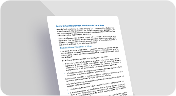 82 External Review of Adverse Benefit Determination after Internal Appeal Generally, health benefit claims are handled directly by Cigna if you use a provider in the Cigna Open Access Plus network. After you have exhausted the Plan’s internal claims a nd appeals process, you may exercise your option to seek an external review with an Independent Review Organization (IRO) that conducts reviews of adverse benefit determinations. This External Review process is intended to comply with the Affordable Care Act’s external review requirements. If you are not literate in English, depending on the county in which you reside, you may be eligible for assistance in the non - English language in which you are literate. Call the Fund Office at 202 - 785 - 8148 or toll - free at 800 - 457 - 3481 for more information. The External Review Process Works as Follow s : If your appeal of a claim is denied, whether it’s a pre - service, post - service, or urgent care claim, you may request further review by an Independent Review Organization ( IRO) as described below. You may only request external review after you have exhausted the internal review and appeals process described above. NOTE: External review is only available for the following types of claim denials : • A denial that involves medical judgment, including, but not limited to, those based on the Plan’s requirements for medical necessity, appropriateness, health care setting, level of care or effectiveness of a covered benefit, or a determination that a treatment is experimental or invest igational. The IRO will determine whether a denial involves a medical judgment; and • A denial due to a rescission of coverage (retroactive elimination of coverage), regardless of whether the rescission has any effect on any particular benefit at that time. External review is not available for any other types of denials, including if your claim was denied due to your failure to meet the requirements for eligibility under the terms of the Plan. Under limited circumstances, you may be able to seek external rev iew before the internal claims and appeals process has been completed: • If the Plan waives the requirement that you complete its internal claims and appeals process first. • In an urgent care situation (see “Expedited External Review o f Claim s ”). Generally, a n urgent care situation is one in which your health may be in serious jeopardy or, in the opinion of your health care professional, you may experience pain that cannot be adequately controlled while you wait for a decision on your internal appeal. • If the Plan has not followed its own internal claims and appeals process and the failure was more than a minor error. In this situation, the internal claims and appeal is “deemed exhausted,” and you may proceed to external review. If you think that this situation exists, and the Plan disagrees, you may request that the Plan explain in writing why you are not entitled to seek external review at this time. Your request for external review of a denial must be made, in writing, within four (4) calendar months of the date that you receive the denial. Because the Plan’s internal review and appeals process generally must be exhausted before external review is available, typically external review of claims will only be available for denials of appeals (and not initial cla im denials). 1. Preliminary Review a. Within five (5) business days of the Plan’s receipt of your external review request for a claim, the Plan will complete a preliminary review of the request to determine whether: