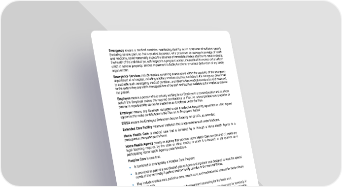 105 Emergency means a medical condition manifesting itself by acute symptoms of sufficient severity (including severe pain) so that a prudent layperson, who possesses an average knowledge of health and medicine, could reasonably expect the absence of immediate medical attention to result in placing the health of the individual (or, with respect to a pregnant woman, the health of the woman or her unborn child) in serious jeopardy; serious impairment to bodily functions; or serious dysfunction of any bodily organ or part. Emergency Services include medical screening e xaminations within the capability of the emergency department of a hospital, including ancillary services routinely available to the emergency department to evaluate such emergency medical condition, and other further medical examination and treatment, to the extent they are within the capabilities of the staff and facilities available at the hosp ital to stabilize the patient. Employee means a person who is actively working for an Employer in a covered position and on whose behalf the Employer makes the re quired contributions to Plan. An unincorporated sole proprietor or partner in a partnership cannot be treated as an Employee und er the Plan. Employer means any Employer obligated under a collective bargaining agreement or other signed agreement to make co ntributions to the Plan on its Employees’ behalf. ERISA means the Employee Retirement Income Se curity Act of 1974, as amended. Extended Care Facility means an institution that is a pproved as such under Medicare. Home Health Care is medical care that is fu rnished by or through a Home Health Agency to a participant in the participant’ s home. Home Health Agency means an agency that provides Home Health Care services that (1) meets any legal licensing required by the state or other locality in which it is loca ted; or (2) qualifies as a participating Hom e Health Agency under Medicare. Hospice Care is care that: • Is furnished or arranged by a Hospice Care Program; • Is provided as part of a coordinated plan of home and inpatient care designed to meet the special n eeds of the terminally ill patient and the family unit due to the terminal illness; • May include medical care, palliative care, respite care, and medical social services for the terminally ill patient; and • May include medical social services and bereavement counseling for the family unit. Hospice Care Program means an agency, facility, or organization that provides care for terminally ill patients and meets established standards, including certification by the National Hospice Organization, Medica re, and any legal licensing required by the state or other locality in which it is located. Illness means a disease or disorder resulting in an unsound condition of the mind or body. Injury means a wound or damage to the body sustained by accident or throu gh external force. Inpatient and Outpatient refer either to the setting in which medical care is given or to a person who is receiving care in that se tting. • When these terms describe the setting in which medical care is given: − Inpatient means that the care is furnished to a person while the person is confined in a facility as a registered bed patient and is being charged a fee for inpatient room and board; and − Outpatient means that the care is furnished to a person while the person is not so confined. • When these terms refer to a person who is receiving medical care: