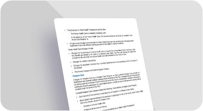 40 • The physician or Allied Health Professional certifies that: − The Home Health Care is medically necessary; and − In the absence of the Home Health Care, the covered individual would be an inpatient at an Acute Care Hospital; or • A Cigna case manager recommends the Home Health Care services as being the most appropriate treatment in the most effective setting possible for the patient’s medical condition. Home Health Care charges include: • Charges for the services of a home health aide on a part - time or intermittent basis. Services under this benefit are limited to 40 visits in a calendar year. Note: The Plan will not pay for visits that exceed the 40 - visit limit. One home health aide visit is limited to four hours or less. • Charges for nutrition counseling. • Charges for psychiatric treatment by a licensed social worker who is practicing within the scope of the license. • Practitioner charges and medical support charges. Hospice Care Charges for Hospice Care by a Hospice Care Program or othe r qualified Hospice Care provider as listed below are covered medical charges under the terms of the Plan. Charges that are incurred only: (a) during a period (no longer than 6 months) for which the Claims Administrator validates a physician’s certificatio n that the participant is a terminally ill patient, and (b) during the bereavement period, will be covered under the terms of the Plan. Covered Hospice Care charges include the following, if provided by a Hospice Care Program: • Confinement of the terminall y ill participant as an inpatient in a Hospice Care facility. • Home Health Care furnished to the terminally ill participant in his or her home. Such Home Health Care may include, as part of Hospice Care: − Services of a home health aide. − Professional services of a Nurse. − Physical therapy or other therapy furnished by an Allied Health Professional. − Charges for nutrition counseling and special meals. − Medical Support Charges. • Charges for medical social services furnished to the terminally ill participant or to t he participant’s family unit. • Charges for bereavement counseling furnished to the terminally ill participant’s family unit during the bereavement period, up to three (3) individual or family sessions for all members of the terminally ill participant’s fami ly unit. • Inpatient Respite Care is limited to eight (8) days per lifetime. For Hospice Care only, the terms of the medical coverage are modified as set forth below to enable Hospice Care charges to meet the definition of covered medical charges: • The excl usion for Custodial Care does not apply.