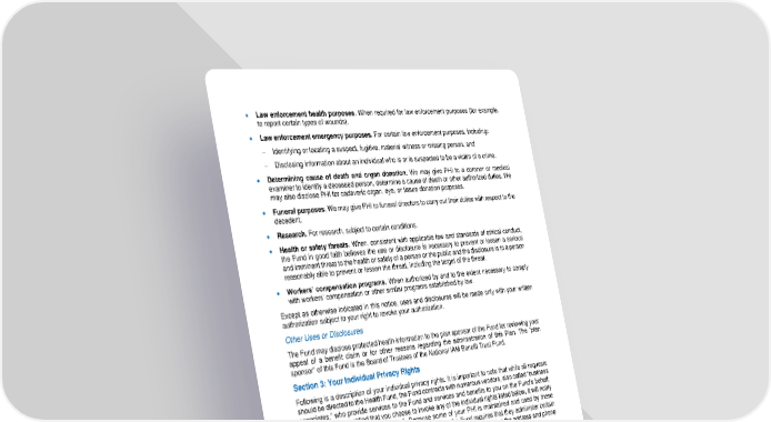 91 • Law enforcement health purposes. When required for law enforcement purposes (for example, to report certain types of wounds). • Law enforcement emergency purposes. For c ertain law enforcement purposes, including: − Identifying or locating a suspect, fugitive, material witness or missing person, and − Disclosing information about an individual who is or is suspected to be a victim of a crime. • Determining cause of death and organ donation. We may give PHI to a coroner or medical examiner to identify a deceased person, determine a cause of death or other authorized duties. We may also disclose PHI for cadaveric organ, eye , or tissue donation purposes. • Funeral purposes. We may give PHI to funeral directors to carry out their duties with respect to the decedent. • Research. For research, subject to certain conditions. • Health or safety threats. When, consistent with applicable law and standards of ethical conduct, the Fund in good f aith believes the use or disclosure is necessary to prevent or lessen a serious and imminent threat to the health or safety of a person or the public and the disclosure is to a person reasonably able to prevent or lessen the threat, including the target of the threat. • Workers’ compensation programs. When authorized by and to the extent necessary to comply with workers’ compensation or other similar programs established by law. Except as otherwise indicated in this notice, uses and disclosures will be made only with your written authorization subject to your right to revoke your authorization. Other Uses or Disclosures The Fund may disclose protected health information to the plan sponsor of the Fund for reviewing your appeal of a benefit claim or for other reasons regarding the administration of this Plan. The “plan sponsor” of this Fund is the Board of Trustees of the National IAM Benefit Trust Fund . Section 3: Y our Individual Privacy Rights Following is a description of your individual privacy rights. It i s important to note that while all requests should be directed to the Health Fund, the Fund contracts with numerous vendors, also called “business associates,” who provide services to the Fund and services and benefits to you on the Fund’s behalf. Once the Fund is notified that you choose to invoke any of the individual rights listed below, it will notify the appropriate vendor on your behalf. Because some of your PHI is maintained and used by these business associates to provide or process your benefits, t he Fund requires that they administer certain aspects of the individual privacy rights. You may contact the Privacy Official at the address and phone number listed below: Ryk Tierney, Privacy Official National IAM Benefit Trust Fund 99 M St. SE, Suite 600 Washington, D.C. 20003 - 3799 Phone: (202) 785 - 8148 Fax: (202) 728 - 0585
