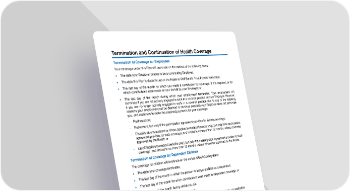 13 Termination and Continuation of Health Coverage Termination of Coverage for Employees Your coverage under this Plan will terminate on the earliest of the following dates: • The date your Employer ceases to be a contributing Employer; • The date this Plan is discontinued or the National IAM Benefit Trust Fu nd is terminated; • The last day of the month for which you made a contribution for coverage, if it is required, or for which contributions were made on your behalf by your Employer; or • The last day of the month during which your employment terminates. Your employment will terminate if you are not actively engaged in work in a covered position for your Employer. However, if you are no longer actively engaged in work in a covered position due to any of the following reasons your employment will be deemed to c ontinue provided your Employer does not terminate you, and continues to make the required payments for your coverage: − Paid vacation; − Retirement, but only if the p articipation a greement provides for Retiree coverage; − Disability due to accident or illness ( applies to medical benefits only); but only if the p articipation a greement provides for such coverage, and limited to no more than 12 months unless otherwise approved by the Board; or − Layoff (applies to medical benefits only); but only if the p articipation a greement provides for such coverage, and limited to no more than 12 months unless otherwise approved by the Board. Termination of Coverage for Dependent Children The coverage for children will terminate on the earlier of the following dates: • The date you r coverage terminates; • The last day of the month in which the person no longer qualifies as a dependent; • The last day of the month for which contributions were made for dependent coverage; or • The last day of the month during which you die. Termination of Coverage for your Spouse The coverage for your Spouse will terminate on the earlier of the following dates, as applicable: • The date your coverage terminates; • The last day of the month during which you divorce or legally separate from your Spouse; or • The last day of the month during which you die. You must provide proof satisfactory to the Fund Office of your divorce or legal separation. Termination of Coverage for Surviving Spouse S urviv or benefits , if allowed, will terminate on the earliest of the following: • The date your surviving spouse dies ; • The last day of the month in which your surviving Spouse remar ries; • The last day of the month in which a monthly contribution is received for coverage; or