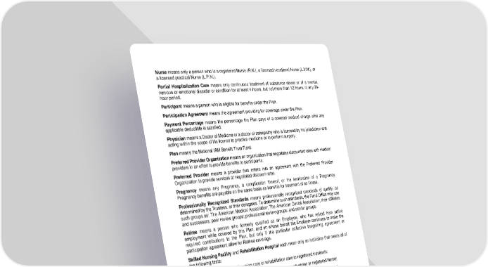 107 Nurse means o nly a person who is a registered Nurse (R.N.), a licensed vocational Nurse (L.V.N.), or a licensed practical Nurse (L.P.N.). Partial Hospitalization Care means only continuous treatment of substance abuse or of a mental, nervous or emotional disorder or co ndition for at least 4 hours, but not more than 12 hours, in an y 24 - hour period. Participant means a person who is eligibl e for benefits under the Plan. Participation Agreement means the agreement providi ng for coverage under the Plan. Payment Percentage means the percentage the Plan pays of a covered medical charge after any applicable deductible is satisfied. Physician means a Doctor of Medicine or a doctor of osteopathy who is licensed by his jurisdiction and acting within the scope of his license to pr actice medicine or to perform surgery. Plan means the National I AM Benefit Trust Fund. Preferred Provider Organization means an organization that negotiates discounted rates with medical providers in an effort to provide benefits to participant s. Preferre d Provider means a provider that enters into an agreement with the Preferred Provider Organization to provide service s at negotiated discount rates. Pregnancy means any Pregnancy, a complication thereof, or the termination of a Pregnancy. Pregnancy benefit s are payable on the same basis as benefits for treatment of an illness . Professionally Recognized Standards means professionally recognized standards of quality, as determined by the Trustees, or their delegates. To determine such standards, the Fund Offi ce may use such groups as: The American Medical Association; The American Dental Association; their affiliates and successors; peer review groups; professional rev iew groups; and similar groups. Retiree means a person who formerly qualified as an Employee, who has retired from active employment while covered by this Plan, and on whose behalf the Employer continues to make the required contributions to the Plan, but only if the particular coll ective bargaining agreement or p articipation a greement allow for R etiree coverage. Skilled Nursing Facility and Rehabilitation Hospital each mean only an institution that meets all of the following tests: • It mainly provides skilled nursing care or rehabilitation care to registered inpatients; • It provides care that is su pervised, 24 hours per day, by a physician or registered Nurse; • It has available at all times a physician who is a staff member of an Acute Care Hospital; • It has a registered Nurse, licensed vocational Nurse, or licensed practical Nurse on duty 24 hours per day and has a registered Nurse on duty at least eight hours per day; • It maintains a daily medical record for each patient; • It complies with all licensing and other legal requirements; • It is not a Specialized Facility; and • It is not, other than incident ally: (1) a place for Custodial Care; (2) a place for the aged; (3) a place for the care of persons addicted to or dependent on a drug or chemical, including alcohol; (4) a place for the care of persons with mental, nervous, or emotional disorders or condi tions; (5) a place of rest; or (6) a nursing home, a hotel, or a similar institution.