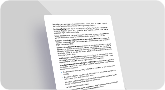 108 Specialist means a physician who provides specialized services, and is not engaged in general practice, family practice, internal medicine, obstetrics/gynecology or pedia trics. Specialized Facility means only an Ambulatory Surgical Facility, a Birth Center, a Mental Health Residential Treatment Center, and a Substance Abuse Residential Treatment Center; whether physically or lega lly a part of another facility. Spouse means the person to whom an Employee is legally married, as determined by both state law and with whom the employee can file a joint income tax return pursuant to the U.S. Tax Code. Substance Abuse Residential Treatment Center means a facility that i s licensed in accordance with the laws of the appropriate legally authorized agency as a residential treatment center for alcoholism, drug or chemical dependence. Substance Abuse Treatment Services are services that are required to treat psychological or physical dependence on alcohol or other mind - altering drugs that requires diagnosis, care, and treatment. In determining benefits payable, charges made for the treatment of any physiologica l conditions related to rehabilitation services for alcohol or drug abuse or addiction will not be considered to be charges for treatment of substance abuse. Total Disability or Totally Disabled means that you or your Spouse are prevented by illness or inj ury from engaging in any duty of your occupation for wages or profit. For your dependent children, it means they are prevented by illness or injury from engaging in their normal daily activities. Usual, Customary and Reasonable Charges or UC&R Charges (som etimes referred to as Maximum Reimbursable Charge or MRC) mean s charges for medically necessary services or supplies that are determined to be the lowest of: • The 90 th percentile of the usual charge by the health care provider for the same or similar servic e or supply; • The prevailing charge of most other health care providers in the same or similar geographic area for the same or similar health care service or supply; • With respect to a Preferred Provider, the charge set forth in the agreement between the Pre ferred Provider and the Preferred Provider Organization or the Plan; or • The health care provider’s actual charge. You and your means the employee/participant who is eligible for coverage under the terms of the plan and who can enroll his or her Spouse and/ or eligible dependent children.