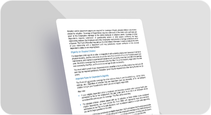 9 Adoption and/or placement papers are required for coverage of legally adopted children and children placed for adoption . C overage of Stepchildren requires submission of the child’s birth certificate and proof of the Emp loyee’s marriage to the child’s biological or adoptive parent. Coverage of other dependents requires submission of guardianship papers or other papers confirming the legal relationship between the Employee and child. Employees must provide a marriage certi ficate to enroll a Spouse. The Fund Office also may ask you for other related information it needs to evaluate the terms of your relationship with a dependent and may periodically request verification of the covered dependent’s status on an ongoing basis. Eligibility for Disabled Children If a dependent child, age 26 or older, is incapable of self - sustaining employment because of mental or physical disability, and the child relies on you for more than one - half of his or her financial support and maintenance , and maintains a permanent residence with you during more than one - half of the calendar year, the child’s coverage may be continued under this Plan if his or her disability began when the child was covered by this Plan, and he or she turned age 26 with th e disability. You must submit proof of your dependent child’s disability to the Fund Office before the child turns 26 and may be required periodically thereafter (proof may be required more often during the first two (2) years). Important Rules for Depende nt’s Eligibility The Fund will not provide coverage for other relatives living in your household (e.g., mother, father, siblings, etc.) regardless of whether they are dependent upon you financially, or for non - biological children living in your household f or whom you are not legally responsible. Also note: • If your eligible dependent child is employed and becomes covered under a group health plan connected to his or her employment, the plan under which he or she is an employee will be considered the primary plan for coverage. This Plan will be secondary. • For adopted children, children placed with you for adoption, or foster children to be considered eligible dependents, you must provide the Fund Office with appropriate legal documentation, satisfactory to the Plan in its sole discretion, such as adoption papers or a court order appointing you as the legal guardian for the child. • For a stepchild to be considered an eligible dependent, the Fund requires that the employee provide a copy of the child’s birth certi ficate and proof of the employee’s marriage to the child’s biological or adoptive parent. The Fund may also require any and all documentation, including paternity papers, court order, state order and/or divorce decree setting forth the relationship with th e child. • If a dependent Spouse is eligible for benefits under this Plan as an active participant, benefits will be payable for the Spouse first as a participant, then as a dependent. In no event will benefits exceed 100% of covered Charges incurred. • If a d ependent child loses eligibility status, the child may regain eligibility only by satisfying all of the requirements included in the Plan’s definition of an eligible dependent and these dependent Eligibility Requirements. The Fund Office will require all p articipants to provide documentation substantiating an individual’s right to status as an eligible dependent. Documentation required by the Fund Office may include: • A marriage certificate (in the English language); • Birth certificate of biological child showing both parents’ names; • Court (legal) documents showing legal guardianship or adoption;