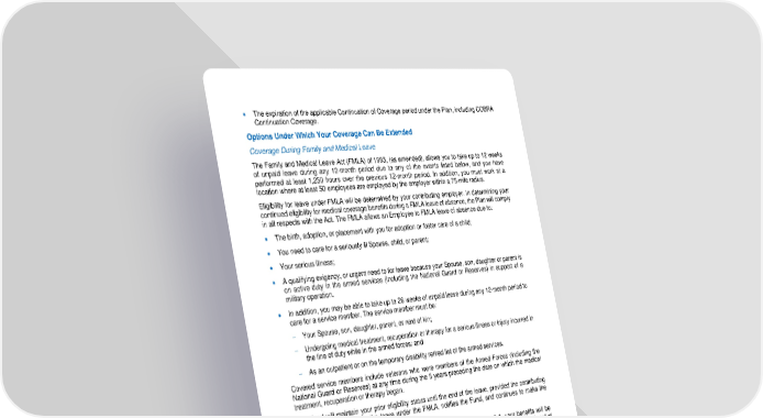 14 • The expirati on of the applicable Continuation of Coverage period under the Plan, including COBRA Continuation Coverage. Options Under Which Your Coverage Can Be Extended Coverage During Family and Medical Leave The Family and Medical Leave Act (FMLA) of 1993, (as ame nded), allows you to take up to 12 weeks of unpaid leave during any 12 - month period due to any of the events listed below, and you have performed at least 1,250 hours over the previous 12 - month period. In addition, you must work at a location where at least 50 employees are employed by the employer within a 75 - mile radius. Eligibility for leave under FMLA will be determined by your contributing employer. In determining your continued eligibility for medical coverage benefits during a FMLA leave of abse nce, the Plan will comply in all respects with the Act. The FMLA allows an Employee to FMLA leave of absence due to: • The birth, adoption, or placement with you for adoption or foster care of a child; • You need to care for a seriously ill Spouse, child, or p arent; • Your serious illness; • A qualifying exigency, or urgent need to for leave because your Spouse, son, daughter or parent is on active duty in the armed services (including the National Guard or Reserves) in support of a military operation. • In additio n, you may be able to take up to 26 weeks of unpaid leave during any 12 - month period to care for a service member. The service member must be: − Your Spouse, son, daughter, parent, or next of kin; − Undergoing medical treatment, recuperation or therapy for a s erious illness or injury incurred in the line of duty while in the armed forces; and − As an outpatient or on the temporary disability retired list of the armed services. Co vered service members include veterans who were members of the Armed Forces (includin g the National Guard or Reserves) at any time during the 5 years preceding the date on which the medical treatment, recuperation or therapy began. The Fund will maintain your prior eligibility status until the end of the leave, provided the contributing E mployer properly grants the leave under the FMLA, notifies the Fund, and continues to make the required contribution to the Fund. If you and your employer have a dispute over your eligibility under the FMLA, your benefits will be suspended pending resolut ion of the dispute, in the absence of the required contribution. The Board of Trustee will have no direct role in resolving the dispute. Coverage under the Plan will continue during the FMLA leave on the same basis as othe r similarly situated employees. Ca ll your employer to determine if you are eligible for the FMLA leave. Then contact the Fund Office if you are planning to take the FMLA leave so that the Fund is aware of your employer’s responsibility to make contributions during your absence. The Board o f Trustee cannot enforce collection of contributions from your employer while you are out on leave. However, you may seek guidance regarding your continued coverage from the Department of Labor ( DOL), EBSA division. Coverage During Qualified Military Servi ce If you enter qualified military service (such as active or inactive duty training or active duty in the United States armed forces or national guard), under the Uniformed Services Employment and Reemployment Rights Act (USERRA), your eligibility for covera ge under the Plan may be protected during the qualified