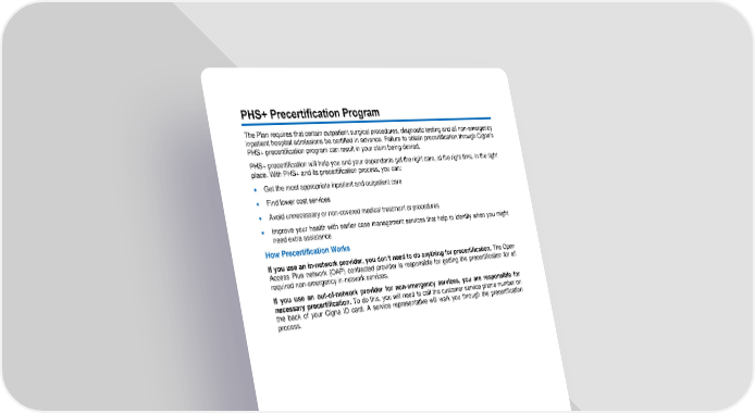 29 PHS+ Precertification Program The Plan requires that certain outpatient surgical procedures, diagnostic testing and all non - emergency inpat ient hospital admissions be certified in advance. Failure to obtain precertification through Cigna’s PHS+ precertification program can result in your claim being denied. PHS+ precertification will help you and your dependents get the right care, at the ri ght time, in the right place. With PHS+ and its precertification process, you can: • Get the most appropriate inpatient and outpatient care • Find lower cost services • Avoid unnecessary or non - covered medical treatment or procedures • Improve your health with e arlier case management services that help to identify when you might need extra assistance How Precertification Works If you use an in - network provider, you don’t need to do anything for precertification. The Open Access Plus network (OAP) contracted prov ider is responsible for getting the precertification for all required non - emergency in - network services. If you use an out - of - network provider for non - emergency services, you are responsible for necessary precertification. To do this, you will need to call the customer service phone number on the back of your Cigna ID card. A service representative will walk you through the precertification process.