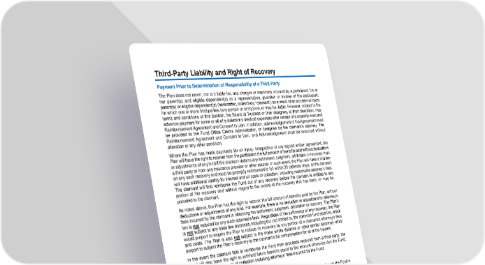 68 Third - Party Liability and Right of Recovery Payment Prior to Determination of Responsibility of a Third Party The Plan does not cover, nor is it liable for, any charges or expenses incurred by a participant, his or her parent(s) and eligible dependent(s) or a representative, guardian or trustee of the participant, parent(s) or eligible dependent(s) (hereinafter, collectively “claimant”) as a result of an accident or injury for which one or more third parties (any person or entity) are, or may be, liable. However, subject to the terms and conditions of this Section, the Board of Trustees or their designee, at their discretion, may advance payment for some or all of a claimant’s medical expenses after receipt of a properly executed Reimbursement Agreement and Consent to Lien. In addition, acknowledgement of the Agreement must be provided to the Fund Office Claims Administrator, or designee by the claimant’s attorney. The Reimbursement Agreement and Consent to Lien, and Ackn owledgement must be executed without alteration or any other condition. Where the Plan has made payments for an injury, irrespective of any signed written agreement, the Plan will have the right to recover from the participant the full amount of benefits p aid without deductions or adjustments of any kind if the claimant obtains any settlement, judgment, arbitration or recovery from a third party or from any insurance provider or other source. In such event, the Plan will have a first lien on any such recove ry and must be promptly reimbursed in full within 30 calendar days, or the claimant will have additional liability for interest and all costs of collection, including reasonable attorney’s fees. The claimant will first reimburse the Fund out of any recover y before the claimant is entitled to any portion of the recovery and without regard to the extent of the recovery that has been, or may be, provided to the claimant. As noted above, the Plan has the right to recover the full amount of benefits paid by the Plan, without deductions or adjustments of any kind. For example, there is no deduction or adjustment for attorney’s fees incurred by the claimant in obtaining the settlement, judgment, arbitration or recovery. The Plan’s lien is not reduced by any such at torney’s fees. Regardless of the sufficiency of any recovery, the Plan is not subject to any state law doctrines, including but not limited to, the common fund doctrine, which would purport to require the Plan to reduce its recovery by any portion of a cla imant’s attorney’s fees and costs. The Plan is also not subject to the make whole doctrine or other similar doctrines which purport to subject the Plan’s recovery to the claimant’s full compensation for all of his Injuries. In the event the claimant fails to reimburse the Fund from proceeds received from a thi rd party, the Fund will also have the right to withhold future benefits equal to the amount otherwise due the Fund, plus interest and the costs of collection including attorneys’ fees incurred by the Fund. Reimbursement and Consent to Lien Every claimant, on whose behalf an advance may be payable, must execute and deliver to the Fund a Reimbursement Agreement and Consent to Lien in the form provided without alteration. Claimants must do whatever is necessary to protect the Fund in obtaining reimbursement an d/or its subrogation rights. Each such claimant must promptly notify the Fund Office if he or she makes a claim or brings an action against a third party or if he or she obtains any settlement, judgment, or other recovery from any source. If a claimant doe s not execute a Reimbursement Agreement or Consent to Lien for any reason, it will not waive, compromise, diminish, release or otherwise prejudice any of the Fund’s reimbursement rights if the Fund, at its discretion, makes an advance and inadvertently pay s benefits in the absence of a Reimbursement Agreement. The Fund’s standard administrative procedure will be used to determine whether a third party might potentially be held liable in connection with an accident or injury. Claims will not be paid until th is determination is made. If it is determined that the claim may be the result of a third party’s negligence or other misconduct, the Fund will not process any claims without a properly signed Reimbursement