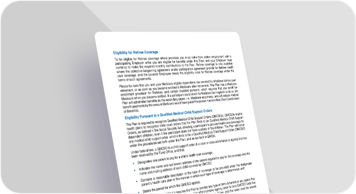11 Eligibility for Retiree Coverage To be eligible for Retiree coverage where provided, you must retire from active employment with a participating Employer while you are eligible for benefits under this Plan, and your Employer must continue to make the required monthly contributions to the Plan. Retiree coverage is only available where the collective bargaining agreement and/or particip ation agreement provide for Retiree health care coverage, and the covered Employee meets the eligibility rules for Retiree coverage under the terms of such agreements. Please be sure that you and your Medicare - eligible dependents are enrolled for Medicare before your retirement, or as soon as you become entitled to Medicare after retirement. This Plan has a Medicare enrollment provision for Retirees (and certain disabled persons) which requires that you enroll for Medicare when you become entitled. If a par ticipant could enroll for Medicare but neglects to do so, the Plan will administer benefits as the secondary payer, i.e., Medicare as primary, and will reduce medical benefit payments by the amount Medicare would have paid if the person had enrolled (See C oordination of Benefits). Eligibility Pursuant to a Qualified Medical Child Support Orders The Plan is required to recognize Qualified Medical Child Support Orders (QMCSOs). QMCSOs require health plans to recognize state court orders that the Plan finds to be Qualified Medical Child Support Orders, as defined in the Social Security Act, directing a participant to provide health care coverage for dependent children, even if the participant does not have custody of the children. The Plan will honor any medica l child support order, which it finds to be a Qualified Medical Child Support Order (QMCSO) under the procedures set forth under the Plan, and as set forth in ERISA. Under federal law, a QMCSO is a child support order of a court or state administrative ag ency that has been received by the Fund Office, and that: • Designates one parent to pay for a child’s health plan coverage; • Indicates the name and last known address of the parent required to pay for the coverage and the name and mailing address of each chi ld covered by QMCSO; • Contains a reasonable description of the type of coverage to be provided under the designated parent’s health care plan or the manner in which such type of coverage is determined; and • States the period for which the QMCSO applies. An o rder is not a QMCSO if it requires the Plan to provide any type or form of benefit or any option that the Plan does not otherwise provide. For a state administrative agency order to be a QMCSO state law must provide that such an order will have the force a nd effect of law, and the order must be issued through an administrative process established by state law. If a court or state administrative agency has issued an order with respect to health care coverage for any of your dependent children, the Plan Admin istrator will determine if that order is a QMCSO as defined by ERISA, and under the terms of the Plan. The Plan Administrator’s determination will be binding on you, the other parent, the child and any other party acting on behalf on the child. If an order is determined to be a QMCSO, the Plan Administrator will notify the parents of each child, and advise them of the Fund’s procedures that must be followed to provide coverage to the dependent children. Coverage of the dependent children will be subject to all terms and provisions of the Plan, including any limits on the selection of providers, and requirement for authorization of services, insofar as is permitted by applicable law. No coverage will be provided for any dependent child under a QMCSO unless al l of the Plan’s requirements for coverage of that dependent child have been satisfied. Coverage of a dependent child