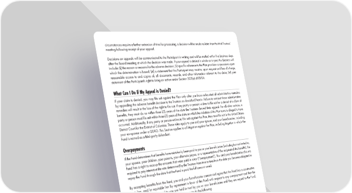 12 circumstances require a further extension of time for processing, a decision will be made no later than the third Trustees’ meeting following receipt of your appeal. Decisions on appeals will be communicated to the Participant in writing and will be mailed within five business days after the Board meeting at which the decision was made. If your appeal is denied in whole or in part, the decision will include: (i) the reason or reasons for the adverse decision; (ii) specific reference to the Plan provision or provisions upon which the determination is based; (iii) a statement that the Participant may receive, upon request and free of charge, reasonable access to and copies of, all documents, records, and other information relevant to the claim; (iv) your statement of the Participant’s right to bring an action under Section 502(a) of ERISA. What Can I Do if My Appeal is Denied? If your claim is denied, you may file suit against the Plan only after you have exhausted all administrative remedies by appealing the adverse benefit decision to the Trustees as described herein. Failure to exhaust these administrative remedies will result in the loss of the right to file suit. If any party or person wishes to file suit for a denial of a claim of benefits, they must do so within three (3) years of the date the Trustees denied their appeal. For all other actions, a party or person must file suit within three (3) years of the date on which the violation of the Plan terms is alleged to have occurred. Additionally, if any party or person wishes to file suit against the Plan, they must file suit in the United States District Court for the District of Columbia. These rules apply to you and your spouse, and your beneficiaries, including your ex-spouse under a QDRO. This Section applies to all litigation against the Plan, including litigation in which the Fund is named as a third-party defendant. Overpayments If the Fund determines that benefits have mistakenly been paid to you or your beneficiaries (including but not limited to, your spouse, your children, your parents, your alternate payee, or a representative of the recipient of the benefits), the Fund has a right to recoup the amounts that were paid in error (“overpayment”).You and your beneficiaries also are required to pay interest at the rate determined by the Trustees from time to time from the date you become obligated to repay the Fund through the date that the Fund is paid the full amount owed. By accepting benefits from the Fund, you and your beneficiaries consent and agree that the Fund has a constructive trust, lien, and/or equitable lien by agreement in favor of the Fund with respect to any overpayment and that the amounts that were overpaid to you are held in trust by you or your beneficiaries until they are repaid to the Fund. You and your beneficiaries also consent and agree to do the following: • To cooperate with the Fund in its attempts to recover overpaid benefits; • To reimburse the Fund for all of its costs and expenses related to the collection of the overpayment; and • To waive any applicable statute of limitations defense available regarding the enforcement of any of the.Fund’s rights to recoup the overpayments. You may repay the overpayment to the Fund directly. If you are not able to repay the Fund directly, the Fund may recover the overpayment by offsetting all future benefits otherwise payable to you or your beneficiaries. This means that the Fund may reduce benefits paid to you or your beneficiaries until it recovers the amounts owed to the Fund. For example, if the overpayment was made to you as the Participant, the Fund may offset the future benefits payable by the Fund to you or your beneficiaries. If the overpayment was made to your beneficiaries, the Fund may offset the future benefits payable by the Fund to you or your beneficiaries.