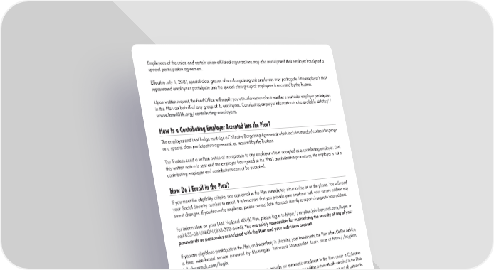 2 Employees of the union and certain union-affiliated organizations may also participate if their employer has signed a special participation agreement. Effective July 1, 2007, special class groups of non-bargaining unit employees may participate if the employer’s IAM represented employees participate and the special class group of employees is accepted by the Trustees. Upon written request, the Fund Office will supply you with information about whether a particular employer participates in the Plan on behalf of any group of its employees. Contributing employer information is also available at http:// www.iam401k.org/contributing-employers. How Is a Contributing Employer Accepted into the Plan? The employer and IAM lodge must sign a Collective Bargaining Agreement, which includes standard contract language or a special class participation agreement, as required by the Trustees. The Trustees send a written notice of acceptance to any employer who is accepted as a contributing employer. Until this written notice is sent and the employer has agreed to the Plan ’s administrative procedures, the employer is not a contributing employer and contributions cannot be accepted. How Do I Enroll in the Plan? If you meet the eligibility criteria, you can enroll in the Plan immediately either online or on the phone. You will need your Social Security number to enroll. It is important that you provide your employer with your current address any time it changes. If you leave the employer, please contact John Hancock directly to report changes to your address. For information on your IAM National 401(k) Plan, please log in to https://myplan.johnhancock.com/login or call 833-38-UNION (833-388-6466). You are solely responsible for maintaining the security of any of your passwords or passcodes associated with the Plan and your individual account. If you are eligible to participate in the Plan, and want help in choosing your investments, the Plan offers Online Advice, a free, web-based service powered by Morningstar Retirement ManagerSM. Learn more at https://myplan. johnhancock.com/login . Effective June 1, 2014, if your employer agrees to provide for automatic enrollment in the Plan under a Collective Bargaining Agreement with an IAM lodge or a participation agreement, you will be automatically enrolled in the Plan with a pre-tax deferral of 3 percent. You will be notified in writing with instructions on how to opt out of automatic enrollment or how to change the deferral amount or investment options if desired. How Are Employee Contributions Made to the Plan? You choose a percentage of your pay that you wish to defer to the Plan as savings for your retirement. That amount is deducted from your pay and forwarded by your employer to the Plan. You can change the amount you are deferring at any time by calling 833-38-UNION (833-388-6466) or by visiting the website: https://myplan.johnhancock.com/login. Once you request a change, you can choose to get a confirmation statement online or have it mailed to your home address. The change will take effect as soon as administratively feasible.