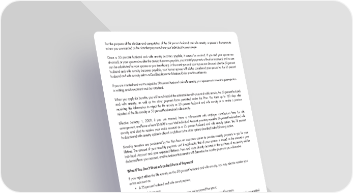 18 For the purpose of the election and computation of the 50 percent husband and wife annuity, a spouse is the person to whom you are married on the date that payments from your Individual Account begin. Once a 50 percent husband and wife annuity becomes payable, it cannot be revoked. If you and your spouse are divorced, or your spouse dies after the annuity becomes payable, your monthly payments will not be increased, and no one can be substituted for your spouse as your beneficiary. In the event you and your spouse are divorced after the 50 percent husband and wife annuity becomes payable, your former spouse will still be considered your spouse for the 50 percent husband and wife annuity unless a Qualified Domestic Relations Order provides otherwise. If you are married and want to reject the 50 percent husband and wife annuity, your spouse must consent to your rejection in writing, and the consent must be notarized. When you apply for benefits, you will be advised of the estimated benefit amount of a life annuity, the 50 percent husband and wife annuity, as well as the other payment forms permitted under the Plan. You have up to 180 days after receiving this information to reject the life annuity or 50 percent husband and wife annuity or to revoke a previous rejection of the life annuity or 50 percent husband and wife annuity. Effective January 1, 2009, if you are married, have a sub-account with employer contributions from the old arrangement, and have at least $5,000 in your total Individual Account, you may reject the 50 percent husband and wife annuity and elect to receive your entire account as a 75 percent husband and wife annuity option. The 75 percent husband and wife annuity option is offered in addition to the other options described in the following section. Monthly annuities are purchased by the Plan from an insurance carrier to provide monthly payments to you for your lifetime. The amount of your monthly payment, and if applicable, that of your spouse, is based on the amount in your Individual Account and your expected lifetimes. Fees and costs directly incurred in the purchase of an annuity will be deducted from your account, and the balance that remains will determine the monthly payments you will receive. What If You Don’t Want a Standard Form of Payment? If you reject either the life annuity or the 50 percent husband and wife annuity, you may elect to receive your entire account as: • A 75 percent husband and wife annuity option; • A single lump sum; • Equal monthly installments, paid over a period not to exceed five years; • A lump sum, plus equal monthly installments, paid over a period not to exceed five years. If your account is paid in any installment form, the last payment due will be adjusted to reflect net investment yield accumulated during the payout period. What Will Your Spouse or Other Beneficiary Receive If You Die Before Receiving Benefits from the Plan? If you have a special sub-account with employer contributions from the old arrangement, a pre-retirement death benefit will be paid to your beneficiaries in a lump sum if you die before your account is distributed. However, if you are married on the date of your death, one-half of your entire account will be used to provide a pre-retirement surviving spouse benefit to your surviving spouse and the remaining half will be paid to your beneficiaries as a pre-retirement death benefit. The pre-retirement surviving spouse benefit provides that if you are married at the time of your death, one-half of your account will be paid to your surviving spouse as a lifetime monthly annuity. If the value of one-half of your total individual account is less than $5,000, the pre-retirement surviving spouse benefit will automatically be paid in a lump sum. If the value is $5,000 or greater, your spouse has the option of electing a lump sum payment instead of the pre- retirement surviving spouse benefit.