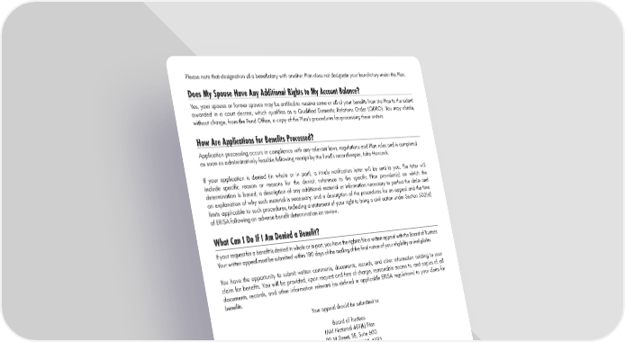 11 Application processing occurs in compliance with any relevant laws, regulations and Plan rules and is completed as soon as administratively feasible following receipt by the Fund’s recordkeeper, John Hancock. If your application is denied (in whole or in part), a timely notification letter will be sent to you.The letter will include specific reason or reasons for the denial; reference to the specific Plan provision(s) on which the determination is based; a description of any additional material or information necessary to perfect the claim and an explanation of why such material is necessary; and a description of the procedures for an appeal and the time limits applicable to such procedures, including a statement of your right to bring a civil action under Section 502(a) of ERISA following an adverse benefit determination on review. What Can I Do If I Am Denied a Benefit? If your request for a benefit is denied in whole or in part, you have the right to file a written appeal with the Board of Trustees. Your written appeal must be submitted within 180 days of the mailing of the final notice of your eligibility or ineligibility. You have the opportunity to submit written comments, documents, records, and other information relating to your claim for benefits. You will be provided, upon request and free of charge, reasonable access to, and copies of, all documents, records, and other information relevant (as defined in applicable ERISA regulations) to your claim for benefits. Your appeal should be submitted to: Board of Trustees IAM National 401(k) Plan 99 M Street, SE, Suite 600 Washington, DC 20003-4595 In making any application or appeal, you may be represented by any authorized representative. If the representative is not an attorney or a court appointed guardian, you must designate the representative in writing. The Board of Trustees will review your appeal at one of its Board meetings.The review of a denied claim shall take into account all comments, documents, records, and other information submitted by you relating to the claim, without regard to whether such information was submitted or considered in the initial benefit determination by the Fund Office. However, neither you nor your representative may make an appearance before the Board. When Will a Decision Be Made on My Appeal? Normally, the Board of Trustees or a committee of the Trustees will review your appeal at its first regularly scheduled quarterly meeting after it receives your appeal. However, if the appeal is received less than 30 days before a meeting, the appeal will be reviewed following the next regularly scheduled meeting of the Board or committee. If special Please note that designation of a beneficiary with another Plan does not designate your beneficiary under this Plan. Does My Spouse Have Any Additional Rights to My Account Balance? Yes, your spouse or former spouse may be entitled to receive some or all of your benefits from the Plan to the extent awarded in a court decree, which qualifies as a Qualified Domestic Relations Order (QDRO). You may obtain, without charge, from the Fund Office, a copy of the Plan’s procedures for processing these orders. How Are Applications for Benefits Processed?