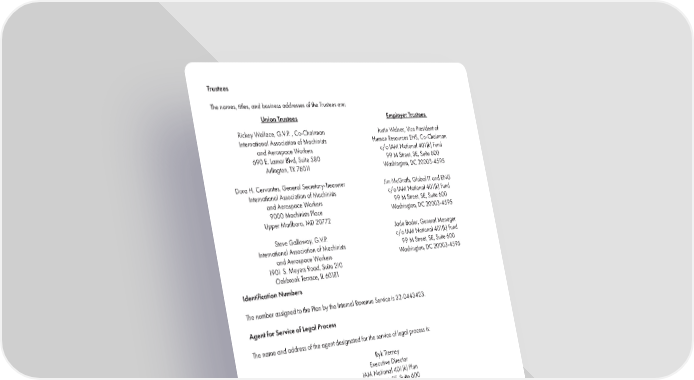 14 Trustees The names, titles, and business addresses of the Trustees are: Union Trustees Rickey Wallace, G.V.P. , Co-Chairman International Association of Machinists and Aerospace Workers 690 E. Lamar Blvd, Suite 580 Arlington, TX 7601 1 Dora H. Cervantes, General Secretary-Treasurer International Association of Machinists and Aerospace Workers 9000 Machinists Place Upper Marlboro, MD 20772 Steve Galloway, G.V.P. International Association of Machinists and Aerospace Workers 1901 S. Meyers Road, Suite 210 Oakbrook Terrace, IL 60181 Employer Trustees Justin Welner, Vice President of Human Resources EHS, Co-Chairman c/o IAM National 401(k) Fund 99 M Street, SE, Suite 600 Washington, DC 20003-4595 Jim McGrath, Global IT and ENG c/o IAM National 401(k) Fund 99 M Street, SE, Suite 600 Washington, DC 20003-4595 Jade Bader, General Manager c/o IAM National 401(k) Fund 99 M Street, SE, Suite 600 Washington, DC 20003-4595 Identification Numbers The number assigned to the Plan by the Internal Revenue Service is 32-0443423. Agent for Service of Legal Process The name and address of the agent designated for the service of legal process is: Ryk Tierney Executive Director IAM National 401(k) Plan 99 M Street, SE, Suite 600 Washington, DC 20003-4595 Source of Contributions The benefits described in this booklet are provided through elective deferrals by employees (i.e. employee contributions) and/or contributions made by employers in accordance with their Collective Bargaining Agreements with the Union. The amount of employee contributions is determined by the automatic enrollment or elective deferrals made by employees in accordance with the terms of the Plan.The amount of employer contributions, if any, is determined by Collective Bargaining Agreements. The Fund Office will provide you, upon written request, a complete list of employers and unions and their addresses that are parties to the Collective Bargaining Agreement. All contributions and income from earnings are used exclusively for providing benefits to employees and beneficiaries and for paying expenses incurred with respect to operation of the Plan. The Plan is a multiemployer profit-sharing defined contribution plan with a cash or deferred arrangement.