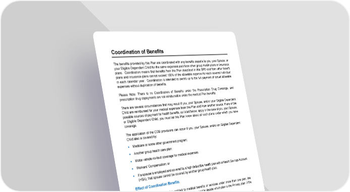 82 Coordination of Benefits The benefits provided by this Plan are coordinated with any benefits payable to you, your Spouse, or your Eligible Dependent Child for the same expenses paid from other group health plans or insurance plans. Coordination means that benefits from the Plan described in this SPD and from other benefit plans and insurance plans cannot exceed 100% of the allowable expense for each covered individual in each calendar year. Coordination is intended to permit up to the full payment of actual allowable expenses without duplication of benefits. Please Note: There is no Coordination of Benefits under the Prescription Drug Coverage, and prescription drug copayments are not reimbursable under the medical Plan benefits. There are several circumstances that may result if you, your Spouse, and/or your Eligible Dependent Child are reimbursed for your medical expenses from this Plan and from another source. If any of the possible sources of payment for health benefits, as listed below, apply in the case of you, your Spouse, or Eligible Dependent Child, you must let this Plan know about all such plans under which you have coverage. The application of the COB provisions can occur if you, your Spouse, and/or an Eligible Dependent Child also is covered by: • Medicare or some other government program; • Another group health care plan; • Motor vehicle no-fault coverage for medical expenses; • Workers’ Compensation; or • If a spouse is employed and covered by a high deductible health plan with a Health Savings Account (HSA), that spouse cannot be covered by another group health plan. Effect of Coordination Benefits When a covered individual is entitled to medical benefits or services under more than one plan, the rules shown in the order as set forth below will be used to decide which plan is the Primary plan. If the Plan described herein: 1. If the Primary Plan among all plans that cover the participant, then its benefits will be determined without taking into account the benefits or services of any other plan. 2. If not the Principal plan, then its benefits may be reduced. The benefits will be reduced so that the benefits provided by all plans will not be more than 100% of the allowable expenses incurred by the applicable participant. The benefits provided under a Plan include the benefits that would have been provided if a claim had been duly made. The benefits from this Plan will never be greater than those that would be paid in the absence of other coverage.