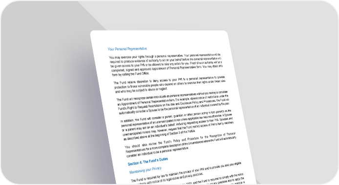 116 Your Personal Representative You may exercise your rights through a personal representative. Your personal representative will be required to produce evidence of authority to act on your behalf before the personal representative will be given access to your PHI or be allowed to take any action for you. Proof of such authority will be a completed, signed and approved Appointment of Personal Representative form. You may obtain this form by calling the Fund Office. The Fund retains discretion to deny access to your PHI to a personal representative to provide protection to those vulnerable people who depend on others to exercise their rights under these rules and who may be subject to abuse or neglect. The Fund will recognize certain individuals as personal representatives without you having to complete an Appointment of Personal Representative form. For example, absent notice of restrictions under the Fund’s Right to Request Restrictions on the Use and Disclosure Policy and Procedures, the Fund will automatically consider a Spouse to be the personal representative of an individual covered by the plan. In addition, the Fund will consider a parent, guardian or other person acting in loco parentis as the personal representative of an unemancipated minor unless applicable law requires otherwise. A Spouse or a parent may act on an individual’s behalf, including requesting access to their PHI. Spouses and unemancipated minors may, however, request that the Fund restrict access of PHI to family members as described above at the beginning of Section 3 of this Notice. You should also review the Fund’s Policy and Procedure for the Recognition of Personal Representatives for a more complete description of the circumstances where the Fund will automatically consider an individual to be a personal representative. Section 4: The Fund’s Duties Maintaining your Privacy The Fund is required by law to maintain the privacy of your PHI and to provide you and your eligible dependents with notice of its legal duties and privacy practices. This notice is effective beginning on April 14, 2003, and the Fund is required to comply with the terms of this notice. However, the Fund reserves the right to change its privacy practices and to apply the changes to any PHI received or maintained by the Fund prior to that date. If a privacy practice is changed, a revised version of this notice will be provided to you and to all past and present participants and beneficiaries for whom the Fund still maintains PHI. A Privacy Notice will be sent by U.S. Mail. Any revised version of this notice will be distributed within 60 days of the effective date of any material change to: • The uses or disclosures of PHI, • Your individual rights, • The duties of the Plan, or • Other privacy practices stated in this notice.