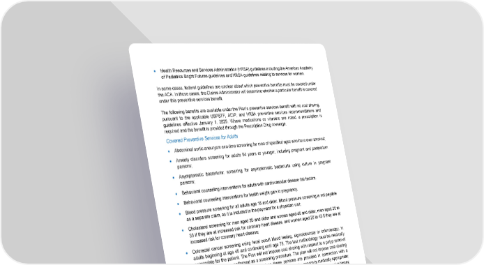 57 • Health Resources and Services Administration (HRSA) guidelines including the American Academy of Pediatrics Bright Futures guidelines and HRSA guidelines relating to services for women. In some cases, federal guidelines are unclear about which preventive benefits must be covered under the ACA. In those cases, the Claims Administrator will determine whether a particular benefit is covered under this preventive services benefit. The following benefits are available under the Plan’s preventive services benefit with no cost sharing, pursuant to the applicable USPSTF, ACIP, and HRSA preventive services recommendations and guidelines effective January 1, 2025. Where medications or vitamins are noted, a prescription is required and the benefit is provided through the Prescription Drug coverage. Covered Preventive Services for Adults • Abdominal aortic aneurysm one-time screening for men of specified ages who have ever smoked; • Anxiety disorders screening for adults 64 years or younger, including pregnant and postpartum persons; • Asymptomatic bacteriuria: screening for asymptomatic bacteriuria using culture in pregnant persons; • Behavioral counseling interventions for adults with cardiovascular disease risk factors. • Behavioral counseling interventions for health weight gain in pregnancy. • Blood pressure screening for all adults age 18 and older. Blood pressure screening is not payable as a separate claim, as it is included in the payment for a physician visit; • Cholesterol screening for men aged 35 and older and women aged 45 and older, men aged 20 to 35 if they are at increased risk for coronary heart disease, and women aged 20 to 45 if they are at increased risk for coronary heart disease; • Colorectal cancer screening using fecal occult blood testing, sigmoidoscopy or colonoscopy, in adults beginning at age 45 and continuing until age 75. The test methodology must be medically appropriate for the patient. The Plan will not impose cost sharing with respect to a polyp removal during a colonoscopy performed as a screening procedure. The plan will not impose cost-sharing with respect to the following services when these services are provided in connection with a screening colonoscopy and the attending provider determines the service is medically appropriate; anesthesia services; a pre-procedure specialist consultation; or a pathology exam on a polyp biopsy; • Depression and suicide risk screening for adults; • Type two (2) diabetes screening for asymptomatic adults aged 35 to 70 years who are overweight or have obesity ; ; • Diet counseling for adults at higher risk for chronic disease; • Exercise interventions to prevent falls in community-dwelling adults 65 years or older who are at increased risk for falls. • HIV screening for all adolescents and adults ages 15 to 65 and for younger and older individuals at increased risk;