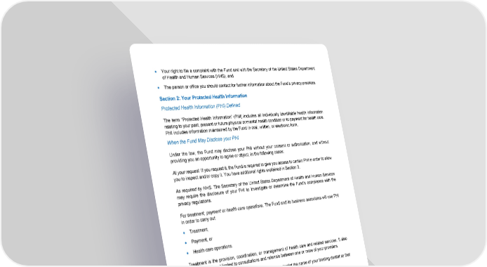 111 • Your right to file a complaint with the Fund and with the Secretary of the United States Department of Health and Human Services (HHS), and • The person or office you should contact for further information about the Fund’s privacy practices. Section 2: Your Protected Health Information Protected Health Information (PHI) Defined The term “Protected Health Information” (PHI) includes all individually identifiable health information relating to your past, present or future physical or mental health condition or to payment for health care. PHI includes information maintained by the Fund in oral, written, or electronic form. When the Fund May Disclose your PHI Under the law, the Fund may disclose your PHI without your consent or authorization, and without providing you an opportunity to agree or object, in the following cases: At your request. If you request it, the Fund is required to give you access to certain PHI in order to allow you to inspect and/or copy it. You have additional rights explained in Section 3. As required by HHS. The Secretary of the United States Department of Health and Human Services may require the disclosure of your PHI to investigate or determine the Fund’s compliance with the privacy regulations. For treatment, payment or health care operations. The Fund and its business associates will use PHI in order to carry out: • Treatment, • Payment, or • Health care operations. Treatment is the provision, coordination, or management of health care and related services. It also includes but is not limited to consultations and referrals between one or more of your providers. For example, the Fund may disclose to a treating orthodontist the name of your treating dentist so that the orthodontist may ask for your dental x-rays from the treating dentist. Payment includes, but is not limited to, actions to make coverage determinations and payment (including billing, claims management, subrogation, Fund reimbursement, reviews for Medical Necessity and appropriateness of care, utilization review and preauthorization). For example, the Fund may tell a doctor whether you are eligible for coverage or what percentage of the bill will be paid by the Plan. If we contract with third parties to help us with payment operations, such as a physician that reviews medical claims, we will also disclose information to them. These third parties are known as “business associates.” Health care operations includes, but is not limited to, quality assessment and improvement, reviewing competence or qualifications of health care professionals, underwriting, premium rating and other insurance activities relating to creating or renewing insurance contracts. It also includes disease management, case management, conducting or arranging for medical review, legal services, and
