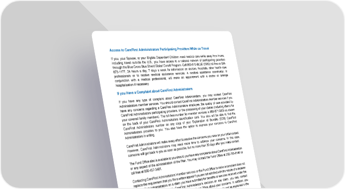 37 Access to CareFirst Administrators Participating Providers While on Travel If you, your Spouse, or your Eligible Dependent Children need medical care while away from home, including travel outside the U.S., you have access to a national network of participating providers through the Blue Cross Blue Shield Global Core ® Program. Call 800-810-BLUE (2583) toll-free or 804- 673-1177, 24 hours a day, 7 days a week for information on doctors, hospitals, other health care professionals or to receive medical assistance services. A medical assistance coordinator, in conjunction with a medical professional, will make an appointment with a doctor or arrange hospitalization if necessary. If you Have a Complaint about CareFirst Administrators If you have any type of complaint about CareFirst Administrators, you may contact CareFirst Administrators member services. You should contact CareFirst Administrators member services if you have any concerns regarding a CareFirst Administrators employee, the quality of care provided by CareFirst Administrators participating providers, or the processing of your claims (including claims for your covered family members). The toll-free number for member services is 866-871-0839 as shown on the back of your CareFirst Administrators identification card. You also will be able to find the CareFirst Administrators number on any copy of your Explanation of Benefits (EOB) CareFirst Administrators provides to you. You also have the option to express your concerns to CareFirst Administrators in writing. CareFirst Administrators will make every effort to resolve the concerns you raise on your initial contact. However, CareFirst Administrators may need more time to address your concerns. In this case, someone will get back to you as soon as possible, but no more than 30 days after your initial contact. The Fund Office also is available to you should you have any complaints about CareFirst Administrators or any aspect of the administration of the Plan. You may contact the Fund Office at 202-785-8148 or toll free at 800-457-3481. Contacting CareFirst Administrators’ member services or the Fund Office to make a complaint does not replace the requirement that you file a written appeal if you are not satisfied with the results of a decision by CareFirst Administrators on a claim you have submitted for benefits or services received under the Plan. If you do not agree with CareFirst Administrator’s decision on any claim, you may contact CareFirst Administrators member services or the Fund Office about your concerns. In addition, you must make a written request as set forth under the section governing appeals and as explained in the section “Claims and Appeals Procedures” included in this SPD.