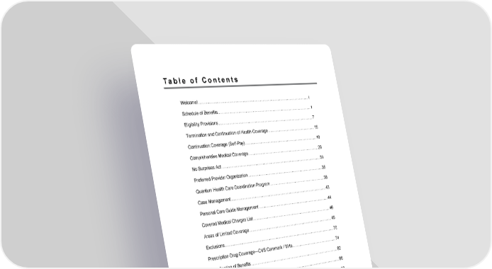 ii T a b l e o f C o n t e n t s Welcome! .............................................................................................................. i Schedule of Benefits.............................................................................................. 1 Eligibility Provisions ............................................................................................... 7 Termination and Continuation of Health Coverage ................................................ 15 Continuation Coverage (Self-Pay) ......................................................................... 19 Comprehensive Medical Coverage ........................................................................ 28 No Surprises Act ................................................................................................... 31 Preferred Provider Organization ............................................................................ 35 Quantum Health Care Coordination Program ........................................................ 38 Case Management ................................................................................................ 43 Personal Care Guide Management ....................................................................... 44 Covered Medical Charges List ............................................................................... 46 Areas of Limited Coverage .................................................................................... 49 Exclusions ............................................................................................................. 70 Prescription Drug Coverage—CVS Caremark / Virta ............................................. 74 Coordination of Benefits ........................................................................................ 82 Third-Party Liability and Right of Recovery ............................................................ 88 Claims Filing and Appeal Procedures .................................................................... 92 Miscellaneous Provisions and Cost Savings Advice .............................................. 109 General Benefit Provisions .................................................................................... 119 General Information ............................................................................................... 120 Glossary ................................................................................................................ 126 Statement of ERISA Rights ................................................................................... 136