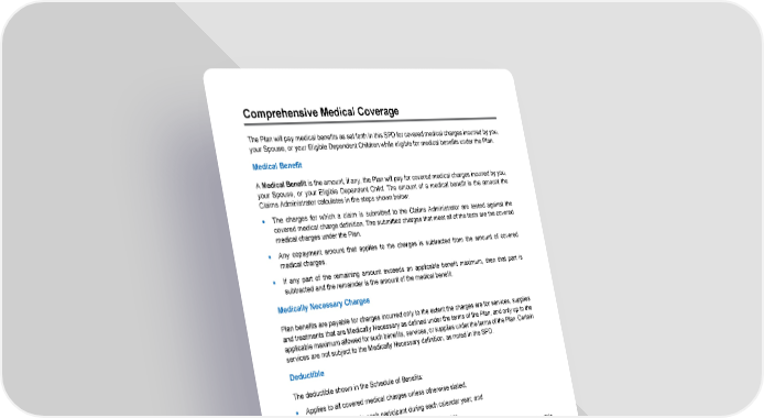28 Comprehensive Medical Coverage The Plan will pay medical benefits as set forth in this SPD for covered medical charges incurred by you, your Spouse, or your Eligible Dependent Children while eligible for medical benefits under the Plan. Medical Benefit A Medical Benefit is the amount, if any, the Plan will pay for covered medical charges incurred by you, your Spouse, or your Eligible Dependent Child. The amount of a medical benefit is the amount the Claims Administrator calculates in the steps shown below: • The charges for which a claim is submitted to the Claims Administrator are tested against the covered medical charge definition. The submitted charges that meet all of the tests are the covered medical charges under the Plan. • Any copayment amount that applies to the charges is subtracted from the amount of covered medical charges. • If any part of the remaining amount exceeds an applicable benefit maximum, then that part is subtracted and the remainder is the amount of the medical benefit. Medically Necessary Charges Plan benefits are payable for charges incurred only to the extent the charges are for services, supplies and treatments that are Medically Necessary as defined under the terms of the Plan, and only up to the applicable maximum allowed for such benefits, services, or supplies under the terms of the Plan. Certain services are not subject to the Medically Necessary definition, as noted in the SPD. Deductible The deductible shown in the Schedule of Benefits: • Applies to all covered medical charges unless otherwise stated; • Applies separately to each participant during each calendar year; and • Must be accumulated during the applicable calendar year. No charge will be subject to more than one deductible amount. Only those charges to which a deductible applies will be applied to satisfy the applicable deductible. When a covered individual’s cumulative deductible in a calendar year reaches the individual deductible maximum amount as shown in the Schedule of Benefits, the deductible will be considered met in full, and no further deductible amounts will be applied to any charges incurred by the applicable participating individual in the applicable calendar year. Family Deductible Maximum When eligible covered individuals in your family have accumulated their individual deductible amounts in any calendar year that, when combined, reach the family deductible maximum amount as shown in the Schedule of Benefits, the family deductible will be considered met in full, and no further deductible