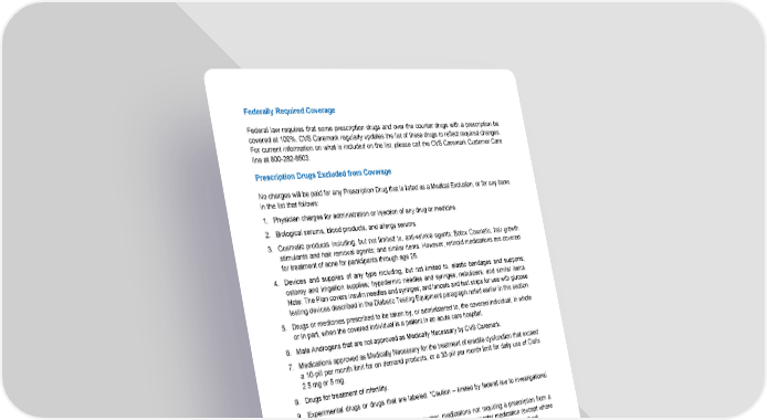 80 Federally Required Coverage Federal law requires that some prescription drugs and over the counter drugs with a prescription be covered at 100%. CVS Caremark regularly updates the list of these drugs to reflect required changes. For current information on what is included on the list, please call the CVS Caremark Customer Care line at 800-282-8503. Prescription Drugs Excluded from Coverage No charges will be paid for any Prescription Drug that is listed as a Medical Exclusion, or for any items in the list that follows: 1. Physician charges for administration or injection of any drug or medicine. 2. Biological serums, blood products, and allergy serums. 3. Cosmetic products including, but not limited to, anti-wrinkle agents; Botox Cosmetic, hair growth stimulants and hair removal agents; and similar items. However, retinoid medications are covered for treatment of acne for participants through age 25. 4. Devices and supplies of any type including, but not limited to, elastic bandages and supports; ostomy and irrigation supplies; hypodermic needles and syringes; nebulizers; and similar items. Note: The Plan covers insulin needles and syringes; and lancets and test strips for use with glucose testing devices described in the Diabetic Testing Equipment paragraph noted earlier in this section. 5. Drugs or medicines prescribed to be taken by, or administered to, the covered individual, in whole or in part, when the covered individual is a patient in an acute care hospital. 6. Male Androgens that are not approved as Medically Necessary by CVS Caremark. 7. Medications approved as Medically Necessary for the treatment of erectile dysfunction that exceed a 10-pill per month limit for on demand products, or a 30-pill per month limit for daily use of Cialis 2.5 mg or 5 mg. 8. Drugs for treatment of infertility. 9. Experimental drugs or drugs that are labeled: “Caution – limited by federal law to investigational use”. 10. Medications lawfully obtainable over-the-counter, medications not requiring a prescription from a physician, and any medication that is equivalent to an over-the-counter medication (except where federal law requires that certain over-the-counter medications be covered when prescribed). 11. Non-legend drugs other than insulin (except where required by federal law). 12. Refills that are in excess of the number prescribed by the physician, or that are dispensed more than one year after the health care provider’s order. 13. Specialty Medications that are not approved for coverage under the guidelines for the CVS Caremark Specialty Guideline Management program. 14. Prescription drugs that are not included for coverage on the CVS Caremark formulary on the date the prescription is filled, or that are excluded from the formulary in favor of therapeutic equivalents (unless approved under the CVS Caremark review option).