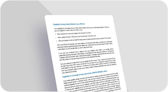 8 Eligibility During Family Medical Leave (FMLA) Your eligibility for coverage while on FMLA will be determined by your contributing employer. However, you are eligible for leave under the FMLA if you: • Have worked for a covered employer for at least 12 months; • Have worked at least 1,250 hours over the previous 12 months; and • Work at a location where at least 50 employees are employed by the employer within 75-mile radius. The Fund Office will maintain your prior eligibility until the end of the leave, provided your contributing employer properly grants the leave under federal law, notifies the Fund, and continues to make monthly contributions on your behalf while you are on approved leave. If you and your employer have a dispute over your eligibility under FMLA, your benefits will be suspended pending resolution of the dispute, in the absence of the required contribution. The Board of Trustees will have no direct role in resolving the dispute. Coverage under this Plan will continue during the FMLA leave on the same basis as other similarly situated employees. Call your employer to determine if you are eligible for FMLA leave. Then, contact the Fund Office if you are planning to take FMLA leave so that the Fund is aware of your employer’s responsibility to make contributions during your absence. The Board of Trustees cannot enforce collection of contributions from your employer while you are out on leave; however, federal authorities may assist you regarding your continued coverage. Eligibility for Coverage During Leave Under USERRA (Military Leave) If you enter qualified military service (such as active or inactive duty training or active duty in the United States armed forces or National Guard), and you have sufficient hours in previous work periods to continue eligibility for one or more months following the month you enter the Uniformed Services, you have the option of continuing your eligibility in the Plan under the Plan’s Continuation of Eligibility rules or freezing your eligibility as of the end of the month in which you enter the Uniformed Services, or as of the date you enter the Uniformed Services if you enter on the first of the month. In addition, you may elect Coverage for yourself and eligible dependent(s) under COBRA Continuation Coverage. However, in accordance with the Uniformed Services Employment and Reemployment Rights Act (USERRA), you must return to work or seek re-employment with an employer following a discharge, under not less than honorable conditions, within the minimum time period allowed. If you do not return to work in Covered Employment or seek re-employment in Covered Employment within the minimum time period allowed, you will forfeit your continued eligibility rights under the Plan. In order to ensure protection of your rights under the USERRA, you must notify the Fund Office as soon as you are called up for qualified military service. If you are covered under the Plan at the time your qualified military service leave begins, your health coverage will be continued by the Fund for your first 30 days of military service providing monthly contributions are made by your Contributing Employer. If you are on uniformed services for more than 30 days, you will be permitted to continue health coverage for yourself 1 and your eligible dependents under the options set forth herein: 1 See option to elect coverage for yourself (not your Spouse or eligible dependents) discussed in the SPD.