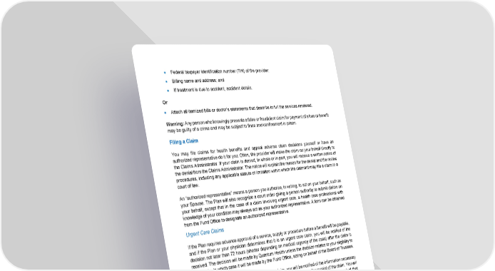 97 • Federal taxpayer identification number (TIN) of the provider; • Billing name and address; and • If treatment is due to accident, accident details. Or • Attach all itemized bills or doctor’s statements that describe in full the services rendered. Warning: Any person who knowingly presents a false or fraudulent claim for payment of a loss or benefit may be guilty of a crime and may be subject to fines and confinement in prison. Filing a Claim You may file claims for health benefits and appeal adverse claim decisions yourself or have an authorized representative do it for you. Often, the provider will make the claim on your behalf directly to the Claims Administrator. If your claim is denied, in whole or in part, you will receive a written notice of the denial from the Claims Administrator. The notice will explain the reason for the denial and the review procedures, including any applicable statute of limitation within which the claimant may file a claim in a court of law. An “authorized representative” means a person you authorize, in writing, to act on your behalf, such as your Spouse. The Plan will also recognize a court order giving a person authority to submit claims on your behalf, except that in the case of a claim involving urgent care, a health care professional with knowledge of your condition may always act as your authorized representative. A form can be obtained from the Fund Office to designate an authorized representative. Urgent Care Claims If the Plan requires advance approval of a service, supply or procedure before a benefit will be payable, and if the Plan or your physician determines that it is an urgent care claim, you will be notified of the decision not later than 72 hours (shorter depending on medical urgency of the case) after the claim is received. The decision will be made by Quantum Health unless the decision relates to your eligibility to participate, in which case it will be made by the Fund Office, acting on behalf of the Board of Trustees. If there is not sufficient information to decide the claim, you will be notified of the information necessary to complete the claim as soon as possible, but not later than 24 hours after receipt of the claim. You will be given a reasonable additional amount of time, but not less than 48 hours, after the end of that additional time period (of after receipt of the information, if earlier). Other Health Claims (Pre-Service and Post-Service) If the Plan requires you to obtain advance approval of a service, supply or procedure before a benefit will be payable, a request for advance approval is considered a pre-service claim and should be filed with Quantum Health. You will be notified of the decision by Quantum Health not later than 15 calendar days after receipt of the pre-service claim. For other claims (post-service claims), you will be notified by CareFirst Administrators of the decision not later than 30 calendar days after receipt of the claim. For either a pre-service or a post-service claim, these time periods may be extended up to an additional 15 calendar days due to circumstances outside