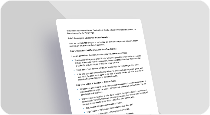 86 If your other plan does not have a Coordination of Benefits provision which coordinates Benefits, the Plan will always be the Primary Plan. Rule 2: Coverage as a Subscriber and as a Dependent If you are covered under one plan as a subscriber and under the other plan as a dependent, the plan which covers you as a subscriber will be Primary. Rule 3: Dependent Child Covered Under More Than One Plan If you are covered as a dependent under two plans, then the rules are as follows: • The coverage of the parents whose birthday is first in the year will be primary and the parent whose birthday is later in the year will be secondary. The word birthday refers only to the month and day in a calendar year; not the year in which the person was born. • If both parents have the same birthday, the benefits of the plan in effect longer will be primary; • If the other plan does not have this rule, instead has a rule based upon the parents’ gender; and if as a result, the plans do not agree on the order of benefits, then the rule in the other plan will determine the order of payment for the claimed benefits. Rule 4: For a Child of Separated or Divorced Parents • If the terms of a court decree specify which parent is responsible for the health care coverage and expenses of the child, and that parent’s plan has actual knowledge of the Court Order, then that parent’s plan shall be primary. • If no such court decree exists, or if the plan of the parent designated under such a court decree as responsible for the child’s health care coverage and expenses does not have actual knowledge of the court decree, benefits for the child are determined in the following order: • First, the plan of the parent with custody of the child; • Then, the plan of the Spouse of the parent with custody of the child; • Finally, the plan of the parent not having custody of the child. Rule 5: Coverage of Active Employee and/or Employee’s Dependent A plan which covers you as an active employee or the dependent is primary. A plan which covers you as a laid-off or retiree employee (or that employee’s dependent) is secondary. If the other plan does not have this rule and if, as a result, the plans do not agree on which plan is primary, this Rule 5 is ignored. Rule 6: Longer/Shorter Length of Coverage If none of the above rules determines the order of benefits, the plan that covered you longer is primary. The length of time a person is covered under a plan is measured from the date the person was first covered under that plan, and does not start over as the result of a change: • In the amount or scope of a plan’s benefits; • In the entity that pays, provides or administers the plan; or