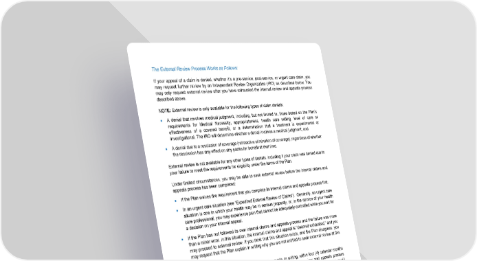 104 The External Review Process Works as Follows: If your appeal of a claim is denied, whether it’s a pre-service, post-service, or urgent care claim, you may request further review by an Independent Review Organization (IRO) as described below. You may only request external review after you have exhausted the internal review and appeals process described above. NOTE: External review is only available for the following types of claim denials : • A denial that involves medical judgment, including, but not limited to, those based on the Plan’s requirements for Medical Necessity, appropriateness, health care setting, level of care or effectiveness of a covered benefit, or a determination that a treatment is experimental or investigational. The IRO will determine whether a denial involves a medical judgment; and • A denial due to a rescission of coverage (retroactive elimination of coverage), regardless of whether the rescission has any effect on any particular benefit at that time. External review is not available for any other types of denials, including if your claim was denied due to your failure to meet the requirements for eligibility under the terms of the Plan. Under limited circumstances, you may be able to seek external review before the internal claims and appeals process has been completed: • If the Plan waives the requirement that you complete its internal claims and appeals process first. • In an urgent care situation (see “Expedited External Review of Claims”). Generally, an urgent care situation is one in which your health may be in serious jeopardy, or, in the opinion of your health care professional, you may experience pain that cannot be adequately controlled while you wait for a decision on your internal appeal. • If the Plan has not followed its own internal claims and appeals process and the failure was more than a minor error. In this situation, the internal claims and appeal is “deemed exhausted,” and you may proceed to external review. If you think that this situation exists, and the Plan disagrees, you may request that the Plan explain in writing why you are not entitled to seek external review at this time. Your request for external review of a denial must be made, in writing, within four (4) calendar months of the date that you receive the denial. Because the Plan’s internal review and appeals process generally must be exhausted before external review is available, typically external review of claims will only be available for denials of appeals (and not initial claim denials). 1. Preliminary Review a. Within five (5) business days of the Plan’s receipt of your external review request for a claim, the Plan will complete a preliminary review of the request to determine whether: • You are/were covered under the Plan at the time the health care item or service is/was requested or, in the case of a retrospective review, were covered under the Plan at the time the health care item or service was provided; • The denial does not relate to your failure to meet the requirements for eligibility under the terms of the Plan; • You have exhausted the Plan’s internal claims and appeals process (except, in limited, exceptional circumstances); and