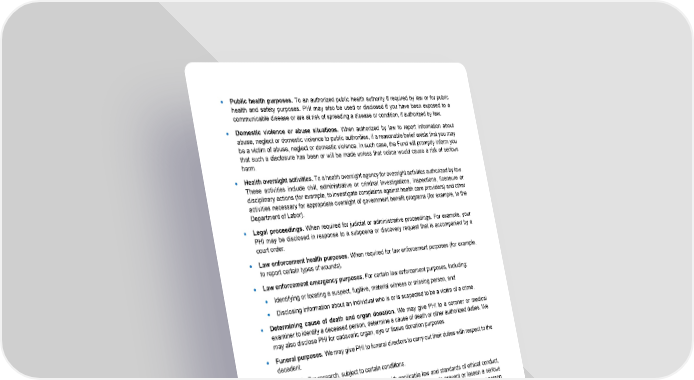 113 • Public health purposes. To an authorized public health authority if required by law or for public health and safety purposes. PHI may also be used or disclosed if you have been exposed to a communicable disease or are at risk of spreading a disease or condition, if authorized by law. • Domestic violence or abuse situations. When authorized by law to report information about abuse, neglect or domestic violence to public authorities, if a reasonable belief exists that you may be a victim of abuse, neglect or domestic violence. In such case, the Fund will promptly inform you that such a disclosure has been or will be made unless that notice would cause a risk of serious harm. • Health oversight activities. To a health oversight agency for oversight activities authorized by law. These activities include civil, administrative or criminal investigations, inspections, licensure or disciplinary actions (for example, to investigate complaints against health care providers) and other activities necessary for appropriate oversight of government benefit programs (for example, to the Department of Labor). • Legal proceedings. When required for judicial or administrative proceedings. For example, your PHI may be disclosed in response to a subpoena or discovery request that is accompanied by a court order. • Law enforcement health purposes. When required for law enforcement purposes (for example, to report certain types of wounds). • Law enforcement emergency purposes. For certain law enforcement purposes, including: • Identifying or locating a suspect, fugitive, material witness or missing person, and • Disclosing information about an individual who is or is suspected to be a victim of a crime. • Determining cause of death and organ donation. We may give PHI to a coroner or medical examiner to identify a deceased person, determine a cause of death or other authorized duties. We may also disclose PHI for cadaveric organ, eye or tissue donation purposes. • Funeral purposes. We may give PHI to funeral directors to carry out their duties with respect to the decedent. • Research. For research, subject to certain conditions. • Health or safety threats. When, consistent with applicable law and standards of ethical conduct, the Fund in good faith believes the use or disclosure is necessary to prevent or lessen a serious and imminent threat to the health or safety of a person or the public and the disclosure is to a person reasonably able to prevent or lessen the threat, including the target of the threat. • Workers’ compensation programs. When authorized by and to the extent necessary to comply with workers’ compensation or other similar programs established by law. Except as otherwise indicated in this notice, uses and disclosures will be made only with your written authorization subject to your right to revoke your authorization. Other Uses or Disclosures The Fund may disclose protected health information to the plan sponsor of the Fund for reviewing your appeal of a benefit claim or for other reasons regarding the administration of this Plan. The “plan sponsor” of this Fund is the Board of Trustees of the National IAM Benefit Trust Fund.