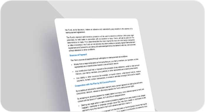 89 the Fund, at its discretion, makes an advance and inadvertently pays benefits in the absence of a reimbursement agreement. The Fund’s standard administrative procedure will be used to determine whether a third party might potentially be held liable in connection with an accident or injury. Claims will not be paid until this determination is made. If it is determined that the claim may be the result of a third party’s negligence or other misconduct, the Fund will not process any claims without a properly signed Reimbursement Agreement and Consent to Lien along with acknowledgement by the claimant’s attorney, both executed without alteration or other conditions. Sources of Payment The Plan’s sources of payment through subrogation or reimbursement are as follows: • Money from a responsible party or third party that you, your family members, your guardian, or other representatives or beneficiaries receive or are entitled to receive; • Any constructive trust that is imposed on the proceeds of any settlement, verdict or other amount that you, your family members, your guardian, or other representatives or beneficiaries receive; • Any liability or other insurance (for example, uninsured motorist, underinsured motorist, medical payments, no-fault, school, homeowners, or excess or umbrella coverage) that is paid or payable. Cooperation with the Plan by All Covered Persons By accepting an advance for related claim payment, every claimant agrees to do nothing that will waive, compromise, diminish, release or otherwise prejudice the Fund’s reimbursement rights. By accepting an advance payment for related claims to an injury, every claimant agrees to notify and consult with the Board of Trustees, its Fund Office or designee before: • Starting any legal action or administrative proceeding against a third party based on any alleged negligent, intentional or otherwise wrongful action that may have caused or contributed to the claimant’s injury that resulted in the Fund’s advance payment of claims; or • Entering into any settlement agreement with that third party or that third party’s insurer that may be related to any actions by that third party that may have caused or contributed to the claimant’s injury that resulted in the Fund’s advance for claims related to such injury. By accepting an advance in claim payments, every claimant agrees to keep the Board of Trustees, its Fund Office or designee informed of all material developments with respect to all such claims, actions, or proceedings. Your Responsibilities You have the duty to cooperate fully with the Plan and any party designated by the Plan Administrator if the Plan’s rights of subrogation or reimbursement are asserted, including executing and delivering any documents the Plan may require or appearing in court for a deposition or testimony, if necessary. You must do nothing to prejudice the Plan’s rights of subrogation and reimbursement.