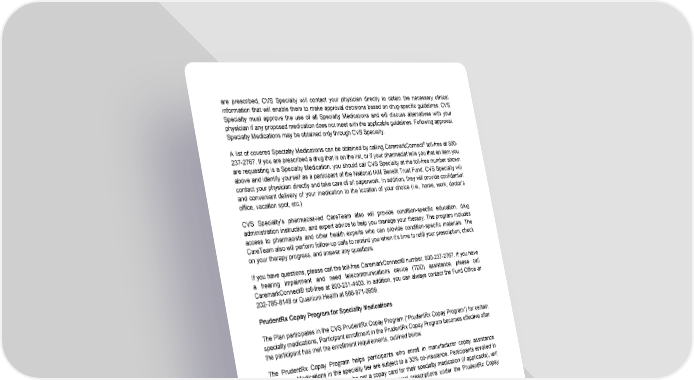 77 are prescribed, CVS Specialty will contact your physician directly to obtain the necessary clinical information that will enable them to make approval decisions based on drug-specific guidelines. CVS Specialty must approve the use of all Specialty Medications and will discuss alternatives with your physician if any proposed medication does not meet with the applicable guidelines. Following approval, Specialty Medications may be obtained only through CVS Specialty. A list of covered Specialty Medications can be obtained by calling CaremarkConnect ® toll-free at 800- 237-2767. If you are prescribed a drug that is on the list, or if your pharmacist tells you that an item you are requesting is a Specialty Medication, you should call CVS Specialty at the toll-free number shown above and identify yourself as a participant of the National IAM Benefit Trust Fund. CVS Specialty will contact your physician directly and take care of all paperwork. In addition, they will provide confidential and convenient delivery of your medication to the location of your choice (i.e., home, work, doctor’s office, vacation spot, etc.) CVS Specialty’s pharmacist-led CareTeam also will provide condition-specific education, drug administration instruction, and expert advice to help you manage your therapy. The program includes access to pharmacists and other health experts who can provide condition-specific materials. The CareTeam also will perform follow-up calls to remind you when it’s time to refill your prescription, check on your therapy progress, and answer any questions. If you have questions, please call the toll-free CaremarkConnect® number, 800-237-2767. If you have a hearing impairment and need telecommunications device (TDD) assistance, please call CaremarkConnect® toll-free at 800-231-4403. In addition, you can always contact the Fund Office at 202-785-8148 or Quantum Health at 866-871-0839. PrudentRx Copay Program for Specialty Medications The Plan participates in the CVS PrudentRx Copay Program (“PrudentRx Copay Program”) for certain specialty medications, Participant enrollment in the PrudentRx Copay Program becomes effective after the participant has met the enrollment requirements, outlined below. The PrudentRx Copay Program helps participants who enroll in manufacturer copay assistance programs. Medications in the specialty tier are subject to a 30% co-insurance. Participants enrolled in the PrudentRx Copay Program who get a copay card for their specialty medication (if applicable), will have a $0 out-of-pocket responsibility for their covered prescriptions under the PrudentRx Copay Program. Copay assistance is a process in which drug manufacturers provide financial support to patients by covering all or most of the patient cost share for select medications, particularly specialty medications. The PrudentRx Copay Program will assist members in obtaining copay assistance from drug manufacturers to reduce a participant’s cost share for eligible medications, thereby reducing out-of- pocket expenses. Participation in the program requires certain data to be shared with the administrators of these copay assistance programs. Any data sharing is done in compliance with HIPAA. If you or a covered family member are not currently taking but will start a new medication covered under the PrudentRx Copay Program, you can contact PrudentRx, or they will proactively contact you to enroll. PrudentRx can be reached at 1-800-578-4403 to address any questions regarding the PrudentRx Copay Program. The Plan may periodically update the PrudentRx Copay Program Drug List.