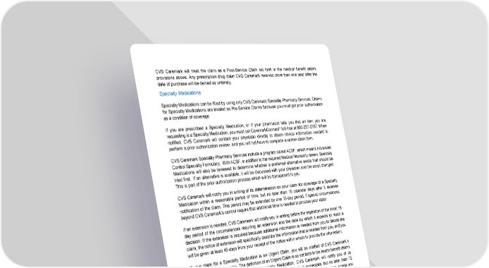 102 CVS Caremark will treat the claim as a Post-Service Claim set forth in the medical benefit claims provisions above. Any prescription drug claim CVS Caremark receives more than one year after the date of purchase will be denied as untimely. Specialty Medications Specialty Medications can be filled by using only CVS Caremark Specialty Pharmacy Services. Claims for Specialty Medications are treated as Pre-Service Claims because you must get prior authorization as a condition of coverage. If you are prescribed a Specialty Medication, or if your pharmacist tells you that an item you are requesting is a Specialty Medication, you must call CaremarkConnect toll-free at 800-237-2767. When notified, CVS Caremark will contact your physician directly to obtain clinical information needed to perform a prior authorization review, and you will not have to complete a written claim form. CVS Caremark Specialty Pharmacy Services include a program called ACSF, which means Advanced Control Specialty Formulary. With ACSF, in addition to the required Medical Necessity review, Specialty Medications will also be reviewed to determine whether a preferred alternative exists that should be tried first. If an alternative is available, it will be discussed with your physician and the script changed. This is part of the prior authorization process which will be transparent to you. CVS Caremark will notify you in writing of its determination on your claim for coverage of a Specialty Medication within a reasonable period of time, but no later than 15 calendar days after it receives notification of the claim. This period may be extended by one 15-day period, if special circumstances beyond CVS Caremark’s control require that additional time is needed to process your claim. If an extension is needed, CVS Caremark will notify you in writing before the expiration of the initial 15- day period of the circumstances requiring an extension and the date by which it expects to reach a decision. If the extension is required because additional information is needed from you to decide the claim, the notice of extension will specifically describe the information that is needed from you, and you will be given at least 45 days from your receipt of the notice within which to provide the information. If your claim for a Specialty Medication is an Urgent Claim, you will be notified of CVS Caremark’s determination more quickly. The definition of an Urgent Claim is as set forth in the health benefit claims section above. For Urgent Claims for Specialty Medication, CVS Caremark will notify you of its determination as soon as possible, taking into account the medical exigencies, but no later than 72 hours after you first call CVS Caremark about the prescription for the Specialty Medication, unless you or your physician fail to provide sufficient information to make the determination, in which case you will be notified within 24 hours of the information that is needed. The determination will then be made no more than 24 hours after CVS Caremark receives the information. Appeals of Prescription Drug Claims Denied by CVS Caremark A. First Level Appeal If you disagree with a determination made by CVS Caremark on any prescription drug claim, you must first submit a request for appeal by contacting CVS Caremark customer care at 800-282-8503 within 180 days of receipt of your denial notice. You should state the reason why you believe your appeal should be approved and include any information supporting your appeal. First level appeals received more than 180 days after receipt of the denial or adverse determination of the claim will be denied as untimely.