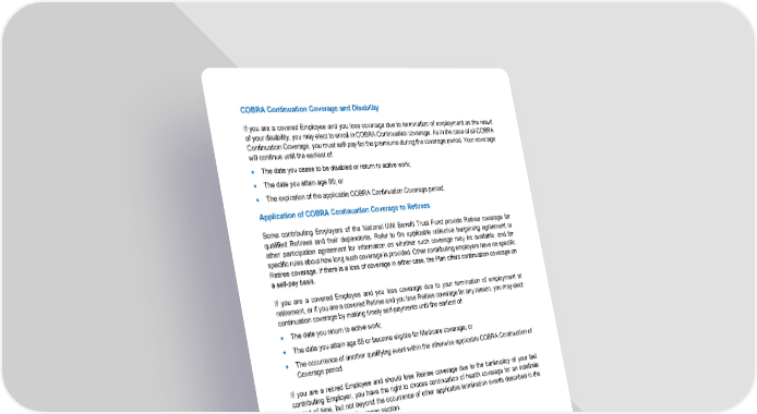 24 COBRA Continuation Coverage and Disability If you are a covered Employee and you lose coverage due to termination of employment as the result of your disability, you may elect to enroll in COBRA Continuation coverage. As in the case of all COBRA Continuation Coverage, you must self-pay for the premiums during the coverage period. Your coverage will continue until the earliest of: • The date you cease to be disabled or return to active work; • The date you attain age 65; or • The expiration of the applicable COBRA Continuation Coverage period. Application of COBRA Continuation Coverage to Retirees Some contributing Employers of the National IAM Benefit Trust Fund provide Retiree coverage for qualified Retirees and their dependents. Refer to the applicable collective bargaining agreement or other participation agreement for information on whether such coverage may be available, and for specific rules about how long such coverage is provided. Other contributing employers have no specific Retiree coverage. If there is a loss of coverage in either case, the Plan offers continuation coverage on a self-pay basis. If you are a covered Employee and you lose coverage due to your termination of employment at retirement, or if you are a covered Retiree and you lose Retiree coverage for any reason, you may elect continuation coverage by making timely self-payments until the earliest of: • The date you return to active work; • The date you attain age 65 or become eligible for Medicare coverage; or • The occurrence of another qualifying event within the otherwise applicable COBRA Continuation of Coverage period If you are a retired Employee and should lose Retiree coverage due to the bankruptcy of your last contributing Employer, you have the right to choose continuation of health coverage for an indefinite period of time, but not beyond the occurrence of other applicable termination events described in the COBRA Continuation Coverage section.