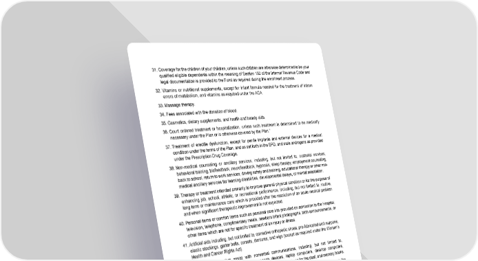 72 31. Coverage for the children of your children, unless such children are otherwise determined to be your qualified eligible dependents within the meaning of Section 152 of the Internal Revenue Code and legal documentation is provided to the Fund as required during the enrollment process. 32. Vitamins or nutritional supplements, except for infant formula needed for the treatment of inborn errors of metabolism, and vitamins as required under the ACA. 33. Massage therapy. 34. Fees associated with the donation of blood. 35. Cosmetics, dietary supplements, and health and beauty aids. 36. Court ordered treatment or hospitalization, unless such treatment is determined to be medically necessary under the Plan or is otherwise covered by the Plan.” 37. Treatment of erectile dysfunction, except for penile implants and external devices for a medical condition under the terms of the Plan, and as set forth in the SPD, and male androgens as provided under the Prescription Drug Coverage. 38. Non-medical counseling or ancillary services, including, but not limited to, custodial services, behavioral training, biofeedback, neurofeedback, hypnosis, sleep therapy, employment counseling, back to school, return to work services, driving safety and training, educational therapy or other non- medical ancillary services for learning disabilities, developmental delays, or mental retardation. 39. Therapy or treatment intended primarily to improve general physical condition or for the purpose of enhancing job, school, athletic, or recreational performance, including, but not limited to, routine, long term or maintenance care which is provided after the resolution of an acute medical problem and when significant therapeutic improvement is not expected. 40. Personal items or comfort items such as personal care kits provided on admission to the Hospital, television, telephone, complimentary meals, newborn infant photographs, birth announcements, or other items which are not for specific treatment of an injury or illness. 41. Artificial aids including, but not limited to, corrective orthopedic shoes, pre-fabricated arch supports, elastic stockings, garter belts, corsets, dentures, and wigs (except as required under the Women’s Health and Cancer Rights Act). 42. Aids or devices that assist with nonverbal communications, including, but not limited to, communication boards, prerecorded speech devices, laptop computers, desktop computers, personal digital assistants, Braille typewriters, visual alert systems for the deaf, and memory books. 43. Medical treatment where payment of claims has been denied by the primary plan because the treatment was received from a non-participating provider, or because of failure to follow the primary plan’s rules for coverage, unless the primary plan Explanation of Benefits (“EOB”) statement shows that the patient is liable for payment. 44. Claims that are received more than one year after the date of service, unless shorter filing limits are required under an in-network provider’s contract with the Preferred Provider Organization. 45. Any services, supplies, or treatments not identified as a covered benefit under the terms of the Plan and as set forth in the SPD. 46. Gene therapy, including treatments, drugs, and related services, such as pre-therapy professional fees, and inpatient hospital, facility, and associated travel costs. 47. Gene therapy medications