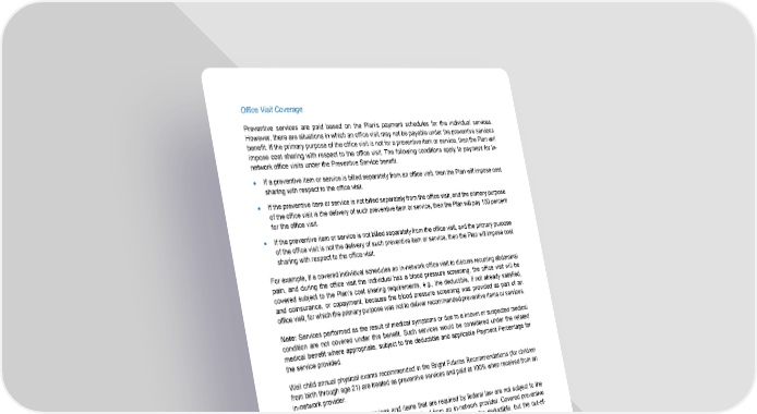 64 Office Visit Coverage Preventive services are paid based on the Plan’s payment schedules for the individual services. However, there are situations in which an office visit may not be payable under the preventive services benefit. If the primary purpose of the office visit is not for a preventive item or service, then the Plan will impose cost sharing with respect to the office visit. The following conditions apply to payment for in- network office visits under the Preventive Service benefit. • If a preventive item or service is billed separately from an office visit, then the Plan will impose cost sharing with respect to the office visit. • If the preventive item or service is not billed separately from the office visit, and the primary purpose of the office visit is the delivery of such preventive item or service, then the Plan will pay 100 percent for the office visit. • If the preventive item or service is not billed separately from the office visit, and the primary purpose of the office visit is not the delivery of such preventive item or service, then the Plan will impose cost sharing with respect to the office visit. For example, if a covered individual schedules an in-network office visit to discuss recurring abdominal pain, and during the office visit the individual has a blood pressure screening, the office visit will be covered subject to the Plan’s cost sharing requirements, e.g., the deductible, if not already satisfied, and coinsurance, or copayment, because the blood pressure screening was provided as part of an office visit, for which the primary purpose was not to deliver recommended preventive items or services. Note: Services performed as the result of medical symptoms or due to a known or suspected medical condition are not covered under this benefit. Such services would be considered under the related medical benefit where appropriate, subject to the deductible and applicable Payment Percentage for the service provided. Well child annual physical exams recommended in the Bright Futures Recommendations (for children from birth through age 21) are treated as preventive services and paid at 100% when received from an in-network provider. Note: Covered preventive services and items that are required by federal law are not subject to the deductible and will be paid at 100% when received from an in-network provider. Covered preventive services received from an out-of-network provider are not subject to the deductible, but the out-of- network Payment Percentage will apply. Please contact Quantum at if you have any questions about what preventive services are covered, or if you need help finding an in-network provider. Routine Examinations The following charges for routine examinations are covered medical benefits under the terms of the Plan. • Charges for annual complete physical exam. • Charges for annual gynecological exam for female participants. • Charges for routine well-child visits for children, including developmental assessment and anticipatory guidance.