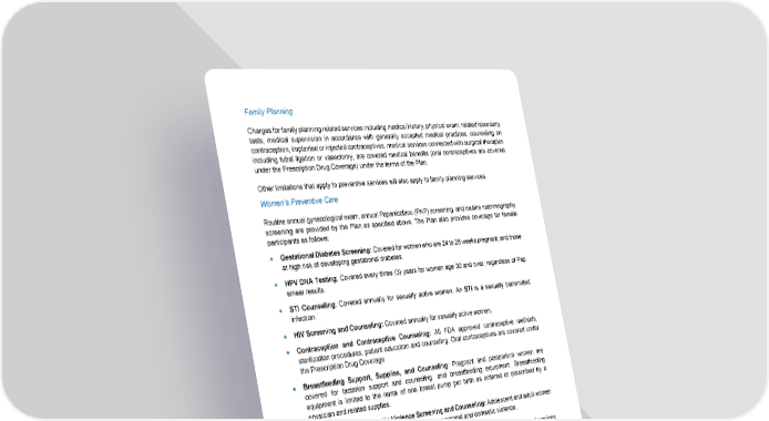 66 Family Planning Charges for family planning related services including medical history, physical exam, related laboratory tests, medical supervision in accordance with generally accepted medical practices, counseling on contraception, implanted or injected contraceptives, medical services connected with surgical therapies including tubal ligation or vasectomy, are covered medical benefits (oral contraceptives are covered under the Prescription Drug Coverage) under the terms of the Plan. Other limitations that apply to preventive services will also apply to family planning services. Women’s Preventive Care Routine annual gynecological exam, annual Papanicolaou (PAP) screening, and routine mammography screening are provided by the Plan as specified above. The Plan also provides coverage for female participants as follows: • Gestational Diabetes Screening: Covered for women who are 24 to 28 weeks pregnant, and those at high risk of developing gestational diabetes. • HPV DNA Testing : Covered every three (3) years for women age 30 and over, regardless of Pap smear results. • STI Counseling : Covered annually for sexually active women. An STI is a sexually transmitted infection. • HIV Screening and Counseling: Covered annually for sexually active women. • Contraception and Contraceptive Counseling: All FDA approved contraceptive methods, sterilization procedures, patient education and counseling. Oral contraceptives are covered under the Prescription Drug Coverage • Breastfeeding Support, Supplies, and Counseling : Pregnant and postpartum women are covered for lactation support and counseling, and breastfeeding equipment. Breastfeeding equipment is limited to the rental of one breast pump per birth as ordered or prescribed by a physician and related supplies. • Interpersonal and Domestic Violence Screening and Counseling: Adolescent and adult women are covered for screening and counseling for interpersonal and domestic violence. The Plan covers the above services in accordance with applicable federal guidelines. Covered services received from an in-network provider are not subject to the deductible and will be paid at 100%. Covered services received from an out-of-network provider are not subject to the deductible, but the out-of- network Payment Percentage will apply. Routine Newborn Care The charges that are listed below for routine care of a newborn at the time of delivery are covered medical benefits under the terms of the Plan and are payable on the same basis as an illness. • Charges of an Acute Care Hospital for routine nursery care furnished to a newborn well baby at the time of birth. • Charges of a physician for one routine examination of a newborn well baby performed each day before the child is released from nursery care.