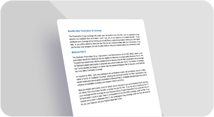 81 Benefits after Termination of Coverage The Prescription Drug Coverage will cease upon termination from the Plan, and no prescription drug benefits are available after termination, even if you are on an extension of medical benefits. If you anticipate your coverage will be ending, you should fill any needed prescriptions before your termination date, or you will be asked to reimburse the Plan for any medication filled after your termination. If you use the mail order program, be sure to order refills so they are received before your termination date. Medicare Part D The Medicare Prescription Drug, Improvement, and Modernization Act of 2003 (MMA) added a new prescription benefit for individuals that are eligible for Medicare coverage called Medicare Part D. The Trustees have determined, with the assistance of an actuary, that the Plan’s prescription drug coverage for Medicare eligible participants is actuarially equivalent to Medicare Part D. This means, on average, the Fund’s benefits are equal to or better than the standard Medicare Part D drug plan, and therefore the Fund offers Creditable Coverage. As required by MMA, each plan participant who is Medicare eligible will periodically receive a notice, called a Notice of Creditable Coverage, advising the individual whether the Plan’s prescription drug benefit continues to be actuarially equivalent to Medicare Part D. An eligible participant also may receive a Notice of Creditable Coverage upon request to the Fund Office. Medicare eligible participants, active or retired, are not required to sign up for Medicare Part D and may still obtain their prescription benefits coverage through the Plan. If you do enroll in Medicare Part D, your coverage and the coverage for your Spouse and your Eligible Dependent Child under the Plan will be terminated. In such a case, there is no adjustment to the cost of the coverage under the Plan. If you choose not to enroll in Medicare Part D, your prescription drug coverage under the Plan will continue for you, your Spouse, and your Eligible Dependent Child.