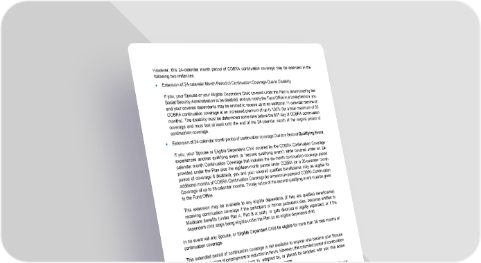 23 However, this 24-calendar month period of COBRA continuation coverage may be extended in the following two instances: • Extension of 24-calendar Month Period of Continuation Coverage Due to Disability If you, your Spouse or your Eligible Dependent Child covered under the Plan is determined by the Social Security Administration to be disabled, and you notify the Fund Office in a timely fashion, you and your covered dependents may be entitled to receive up to an additional 11 calendar months of COBRA continuation coverage at an increased premium of up to 150% (for a total maximum of 35 months). The disability must be determined some time before the 60 th day of COBRA continuation coverage and must last at least until the end of the 24-calendar month of the original period of continuation coverage. • Extension of 24-calendar month period of continuation coverage Due to a Second Qualifying Event If you, your Spouse or Eligible Dependent Child covered by the COBRA Continuation Coverage experiences another qualifying event (a “second qualifying event”) while covered under an 24- calendar month Continuation Coverage that includes the six-month continuation coverage period provided under the Plan plus the eighteen-month period under COBRA (or a 35-calendar month period of coverage if disabled), you and your covered qualified beneficiaries may be eligible for additional months of COBRA Continuation Coverage for a maximum period of COBRA Continuation Coverage of up to 36 calendar months. Timely notice of the second qualifying event must be given to the Fund Office. This extension may be available to any eligible dependents (if they are qualified beneficiaries) receiving continuation coverage if the participant or former participant dies, becomes entitled to Medicare benefits (under Part A, Part B or both), or gets divorced or legally separated, or if the dependent child stops being eligible under the Plan as an eligible dependent child. In no event will any Spouse, or Eligible Dependent Child be eligible for more than 36 total months of continuation coverage. This extended period of continuation coverage is not available to anyone who became your Spouse after the termination of employment or reduction in hours. However, this extended period of continuation coverage is available to any child born to, adopted by, or placed for adoption with you (the active Employee) during the 24-month period of continuation coverage. In no case are you entitled to Continuation Coverage for more than a total of 24 months if your employment is terminated or you have a reduction in hours (unless you are entitled to an additional continuation coverage period on account of disability). Therefore, if you experience a reduction in hours followed by termination of employment, the termination of employment is not treated as a second qualifying event and continuation coverage may not be extended beyond 24 months from the initial, qualifying event.