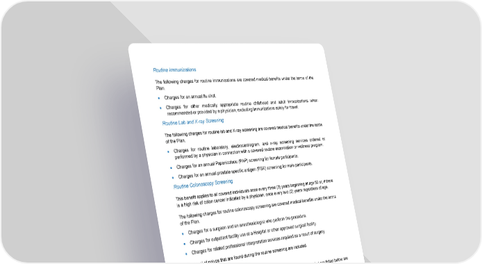 65 Routine Immunizations The following charges for routine immunizations are covered medical benefits under the terms of the Plan. • Charges for an annual flu shot. • Charges for other medically appropriate routine childhood and adult immunizations when recommended or provided by a physician, excluding immunizations solely for travel. Routine Lab and X-ray Screening The following charges for routine lab and X-ray screening are covered medical benefits under the terms of the Plan. • Charges for routine laboratory, electrocardiogram, and x-ray screening services ordered or performed by a physician in connection with a covered routine examination or wellness program. • Charges for an annual Papanicolaou (PAP) screening for female participants. • Charges for an annual prostate specific antigen (PSA) screening for male participants. Routine Colonoscopy Screening This benefit applies to all covered individuals once every three (3) years beginning at age 50 or, if there is a high risk of colon cancer indicated by a physician, once every two (2) years regardless of age. The following charges for routine colonoscopy screening are covered medical benefits under the terms of the Plan. • Charges for a surgeon and an anesthesiologist who perform the procedure. • Charges for outpatient facility use at a Hospital or other approved surgical facility. • Charges for related professional interpretation services required as a result of surgery. Removal of polyps that are found during the routine screening are included. Routine Mammography Screening Charges for routine screening for breast cancer by low-dose mammography that are listed below are covered medical charges if ordered by a physician. Mammography screening charges include only: • Charges for a baseline mammogram for a covered individual age 35 but less than age 40. • Charges for a mammogram performed once every year for a covered individual age 40 and over. The term low-dose mammography means the x-ray examination of the breast using equipment dedicated specifically for mammography, including, but not limited to, the x-ray tube, filter, compression device, screens, films and cassettes, with an average radiation exposure delivery of less than one rad mid-breast, with two views for each breast.