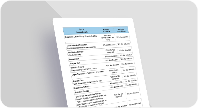 3 Type of Service/Benefit Plan Pays In-Network Plan Pays Out-of-Network Diagnostic Lab and X-ray (Physician’s Office) 100% after applicable office visit copay 70% after deductible Durable Medical Equipment Rental coverage limited to purchase price 90% after deductible 70% after deductible Habilitation Services ABA therapy only 100% after $25 copay/visit 70% after deductible Home Health 90% after deductible 70% after deductible Hospice Care 90% after deductible 70% after deductible Infertility Work-up Diagnostic only-treatment not covered 90% after deductible 70% after deductible Organ Transplant – Paid like any other illness See applicable service 70% after deductible Podiatry Care Limit: Maximum of 30 days/calendar year 100% after $25 copay/visit 70% after deductible Prosthetics/Orthotics 90% after deductible 70% after deductible Radiation Therapy 90% after deductible 70% after deductible Short - Term Rehabilitative Therapy Speech, physical, occupational, cardiac, etc. Plan A+ also includes orthoptic therapy Limit: Maximum of 50 days of treatment per calendar year for all covered therapies 100% after $25 copay/visit 70% after deductible Skilled Nursing Facility Limit: Maximum of 100 days of treatment per calendar year 90% after deductible 70% after deductible Telehealth 100% after applicable office visit copay Not Covered MENTAL HEALTH CARE Inpatient 100% after $75 copay/admit 70% after deductible Outpatient Facility 100% after $50 copay/visit 70% after deductible Outpatient Visit 100% after $20 copay/visit 70% after deductible