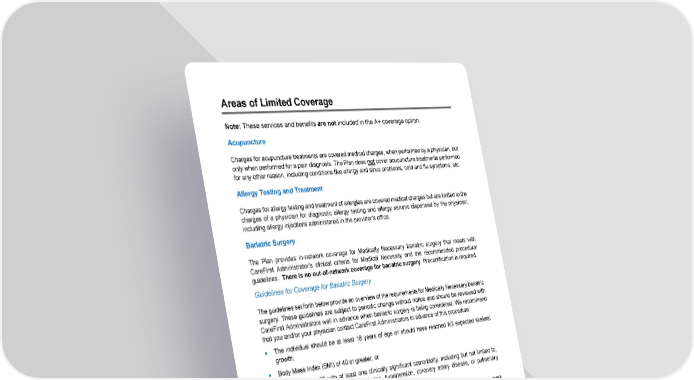 49 Areas of Limited Coverage Note: These services and benefits are not included in the A+ coverage option. Acupuncture Charges for acupuncture treatments are covered medical charges, when performed by a physician, but only when performed for a pain diagnosis. The Plan does not cover acupuncture treatments performed for any other reason, including conditions like allergy and sinus problems, cold and flu symptoms, etc. Allergy Testing and Treatment Charges for allergy testing and treatment of allergies are covered medical charges but are limited to the charges of a physician for diagnostic allergy testing and allergy serums dispensed by the physician, including allergy injections administered in the provider’s office. Bariatric Surgery The Plan provides in-network coverage for Medically Necessary bariatric surgery that meets with CareFirst Administrator’s clinical criteria for Medical Necessity and the recommended procedural guidelines. There is no out-of-network coverage for bariatric surgery . Precertification is required. Guidelines for Coverage for Bariatric Surgery The guidelines set forth below provide an overview of the requirements for Medically Necessary bariatric surgery. These guidelines are subject to periodic change without notice and should be reviewed with CareFirst Administrators well in advance when bariatric surgery is being considered. We recommend that you and/or your physician contact CareFirst Administrators in advance of this procedure. • The individual should be at least 18 years of age or should have reached full expected skeletal growth; • Body Mass Index (BMI) of 40 or greater; or • BMI of at least 35 with at least one clinically significant comorbidity, including but not limited to, cardiovascular disease, Type 2 diabetes, hypertension, coronary artery disease, or pulmonary hypertension; • Failure of medical management, including evidence of active participation within the last two years in a weight-management program that is supervised either by a physician or a registered dietician for a minimum of six months without significant gaps. The program must include monthly documentation of ALL of the following components: − Weight; − Current dietary program; and − Physical activity (e.g., exercise program). Programs such as Virta’s weight management program are acceptable alternatives if done in conjunction with the supervision of a physician or a registered dietician, and detailed documentation of participation is available for review. For individuals with long-standing morbid obesity, participation in a program within the last five years is sufficient if reasonable attendance in the weight-management program over an extended period of time of at least six months can