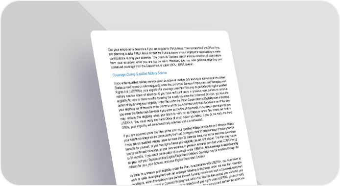 17 Call your employer to determine if you are eligible for FMLA leave. Then contact the Fund Office if you are planning to take FMLA leave so that the Fund is aware of your employer’s responsibility to make contributions during your absence. The Board of Trustees cannot enforce collection of contributions from your employer while you are out on leave. However, you may seek guidance regarding your continued coverage from the Department of Labor (DOL), EBSA division. Coverage During Qualified Military Service If you enter qualified military service (such as active or inactive duty training or active duty in the United States armed forces or national guard), under the Uniformed Services Employment and Reemployment Rights Act (USERRA), your eligibility for coverage under the Plan may be protected during the qualified military service leave of absence. If you have sufficient hours in previous work periods to continue eligibility for one or more months following the month you enter the Uniformed Services, you have the option of continuing your eligibility in the Plan under the Plan’s Continuation of Eligibility rules or freezing your eligibility as of the end of the month in which you enter the Uniformed Services or as of the date you enter the Uniformed Services if you enter on the first of the month. If you freeze your eligibility, you may reclaim this eligibility when you return to work for an Employer under the criteria set forth in USERRA. You must notify the Fund Office of which option you select. If you do not notify the Fund Office, your eligibility will be automatically extended until it is exhausted. If you are covered under the Plan at the time your qualified military service leave of absence begins, your health coverage will be continued by the Fund during your first 30 calendar days of military service. If you are on qualified military leave for more than 30 calendar days, you will be permitted to continue benefits for yourself, or you may opt to freeze your eligibility (as set forth above). The Plan may require you to continued coverage, at your own expense, in premium amounts permitted under COBRA for up to 24 months. If you elect continuation of coverage under USERRA, this coverage is available only to you , not your Spouse and/or Eligible Dependent Children. Coverage may be available through the military for you, your Spouse, and your Eligible Dependent Children. In order to preserve your eligibility under the Plan, in accordance with USERRA, you must return to work or seek re-employment with an employer following a discharge, under not less than honorable conditions, within the minimum time period allowed. If you do not return to work in Covered Employment or seek re-employment in Covered Employment within the required time period, you will forfeit your continued eligibility rights. In order to ensure protection of your rights under USERRA, you must notify the Fund Office as soon as you are called up for qualified military service and set forth the option you have elected to exercise. Your right to maintain and reinstate coverage by reason of qualified military service will be administered and interpreted by the Plan in accordance with the requirements of USERRA. The contributions, if any, credited to you will be kept on the Plan’s records during the qualified military service leave of absence, and your coverage and coverage for your Spouse and your Eligible Dependent Children will be reinstated, provided you return to work in Covered Employment or seek re-employment with an employer within the time period protected under USERRA. If you are honorably discharged from the Uniformed Services, Plan coverage for you, your Spouse, and Eligible Dependent Child will be reinstated on the day you begin work with an Employer participating in the Plan, provided that you comply with the notice on return-to-work requirements of USERRA. These requirements and additional information on USERRA can be found at the Department of Labor website at: http://www.dol.gov/vets/programs/userra/userra_fs.htm .