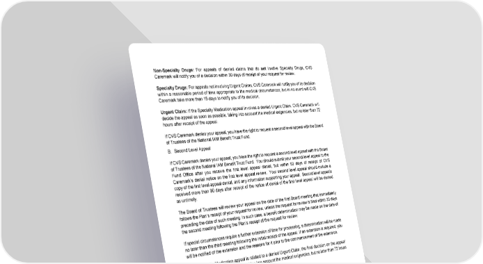 103 Non-Specialty Drugs: For appeals of denied claims that do not involve Specialty Drugs, CVS Caremark will notify you of a decision within 30 days of receipt of your request for review. Specialty Drugs: For appeals not involving Urgent Claims, CVS Caremark will notify you of its decision within a reasonable period of time appropriate to the medical circumstances, but in no event will CVS Caremark take more than 15 days to notify you of its decision. Urgent Claim: If the Specialty Medication appeal involves a denied Urgent Claim, CVS Caremark will decide the appeal as soon as possible, taking into account the medical exigencies, but no later than 72 hours after receipt of the appeal. If CVS Caremark denies your appeal, you have the right to request a second level appeal with the Board of Trustees of the National IAM Benefit Trust Fund. B. Second Level Appeal If CVS Caremark denies your appeal, you have the right to request a second level appeal with the Board of Trustees of the National IAM Benefit Trust Fund. You should submit your second level appeal to the Fund Office after you receive the first level appeal denial, but within 90 days of receipt of CVS Caremark’s denial notice on the first level appeal review. Your second level appeal should include a copy of the first level appeal denial, and any information supporting your appeal. Second level appeals received more than 90 days after receipt of the notice of denial of the first level appeal will be denied as untimely. The Board of Trustees will review your appeal on the date of the first Board meeting that immediately follows the Plan’s receipt of your request for review, unless the request for review is filed within 30 days preceding the date of such meeting. In such case, a benefit determination may be made on the date of the second meeting following the Plan’s receipt of the request for review. If special circumstances require a further extension of time for processing, a determination will be made no later than the third meeting following the initial receipt of the appeal. If an extension is required, you will be notified of the extension and the reasons for it prior to the commencement of the extension. If the Specialty Medication appeal is related to a denied Urgent Claim, the final decision on the appeal will be made as soon as possible, taking into account the medical exigencies, but no later than 72 hours after receipt of the appeal by the Fund Office. External Review of Adverse Benefit Determination after Internal Appeal Generally, health benefit claims are handled directly by CareFirst Administrators if you use a provider in the CareFirst Administrators network. After you have exhausted the Plan’s internal claims and appeals process, you may exercise your option to seek an external review with an Independent Review Organization (IRO) that conducts reviews of adverse benefit determinations. This External Review process is intended to comply with the Affordable Care Act’s external review requirements. If you are not literate in English, depending on the county in which you reside, you may be eligible for assistance in the non-English language in which you are literate. Call the Fund Office at 202-785-8148 or toll-free at 800-457-3481 for more information.