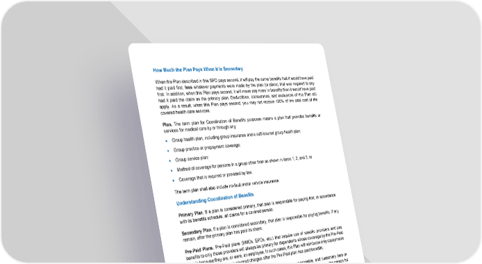 83 How Much the Plan Pays When it is Secondary When the Plan described in this SPD pays second, it will pay the same benefits that it would have paid had it paid first, less whatever payments were made by the plan (or plans) that was required to pay first. In addition, when this Plan pays second, it will never pay more in benefits than it would have paid had it paid the claim as the primary plan. Deductibles, coinsurance, and exclusions of this Plan still apply. As a result, when this Plan pays second, you may not receive 100% of the total cost of the covered health care services. Plan. The term plan for Coordination of Benefits purposes means a plan that provides benefits or services for medical care by or through any: • Group health plan, including group insurance and a self-insured group health plan; • Group practice or prepayment coverage; • Group service plan; • Method of coverage for persons in a group other than as shown in items 1, 2, and 3; or • Coverage that is required or provided by law. The term plan shall also include no-fault motor vehicle insurance. Understanding Coordination of Benefits Primary Plan. If a plan is considered primary, that plan is responsible for paying first, in accordance with its benefits schedule, all claims for a covered person. Secondary Plan. If a plan is considered secondary, that plan is responsible for paying benefits, if any remain, after the primary plan has paid its share. Pre-Paid Plans. Pre-Paid plans (HMOs, EPOs, etc.) that require use of specific providers and pay benefits to only those providers will always be primary for dependents whose coverage by the Pre-Paid plan is because they are, or were, an employee. In such cases, this Plan will reimburse only copayments or expenses that remain on covered charges after the Pre-Paid plan has paid benefits. Allowable Expense. Allowable Expense means any necessary, reasonable, and customary item or expense, at least a part of which is a covered expense under any of the plans that cover the person for whom the claim is made. When the benefits from a plan are in the form of services, not payments, the service is considered to be both an Allowable Expense and a benefit paid. Claim Determination Period. Claim Determination Period means a calendar year. Coordination of Benefits with Medicare and Other Government Programs Medicare. Generally, anyone age 65 or older is entitled to Medicare coverage. Anyone under age 65 who is entitled to Social Security Disability Income Benefits is also entitled to Medicare coverage after a waiting period. Medicare has two parts: Hospital Insurance (Part A) and Medical Insurance (Part B). Part A covers inpatient Hospital care and generally is available to all individuals over age 65 at no cost. Part B covers
