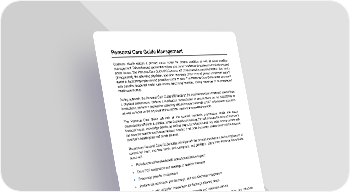 44 Personal Care Guide Management Quantum Health utilizes a primary nurse model for chronic condition as well as acute condition management. This enhanced approach provides one nurse to address clinical needs for all chronic and acute issues. The Personal Care Guide (PCG) nurse will consult with the covered member, their family (if requested), the attending physician, and other members of the covered person’s treatment team to assist in facilitating/implementing proactive plans of care. The Personal Care Guide nurse can assist with benefits, incidental health care issues, becoming healthier, finding resources or an unexpected healthcare journey. During outreach, the Personal Care Guide will touch on the covered member's treatment and perform a physical assessment, perform a medication reconciliation to ensure there are no duplications or interactions, perform a depression screening with subsequent referrals to EAP or in-network providers, as well as focus on the physical and emotional needs of the covered member. The Personal Care Guide will look at the covered member’s psychosocial needs and social determinants of health. In addition to the depression screening, they will evaluate the covered member’s financial issues, knowledge deficits, as well as any cultural barriers that may exist. Conversations with the covered member could occur at least monthly, if not more frequently, and continue until the covered member’s health goals and needs are met. The primary Personal Care Guide nurse will align with the covered member and be the single point of contact for them, and their family and caregivers, and providers. The primary Personal Care Guide nurse will: • Provide comprehensive benefit education/utilization support • Drive PCP designation and steerage to Network Providers • Encourage provider involvement • Perform pre-admission, pre-discharge, and post-discharge engagement • Coordinate with utilization review team for discharge planning needs • Identify gaps in care and alleviate clinical, financial, and humanistic barriers • Coordinate second opinions, drive utilization to other third-party vendor tools, and introduce community resources • Perform behavioral health screening • The primary nurse model has three foundational drivers for the changes: • Humanistic: to help members with acute and chronic needs by assigning a single nurse to the covered member and their family as well as a heightened attention to psychosocial issues that can negatively affect health, quality of life and financial outcomes. • Clinical: identify and prioritize members in need of clinical outreach. Improve adherence to quality measures for preventive health and management of chronic conditions. • Financial: identify and outreach to members at risk for future high costs while encouraging preventive care and chronic condition management to improve health and reduce costs.